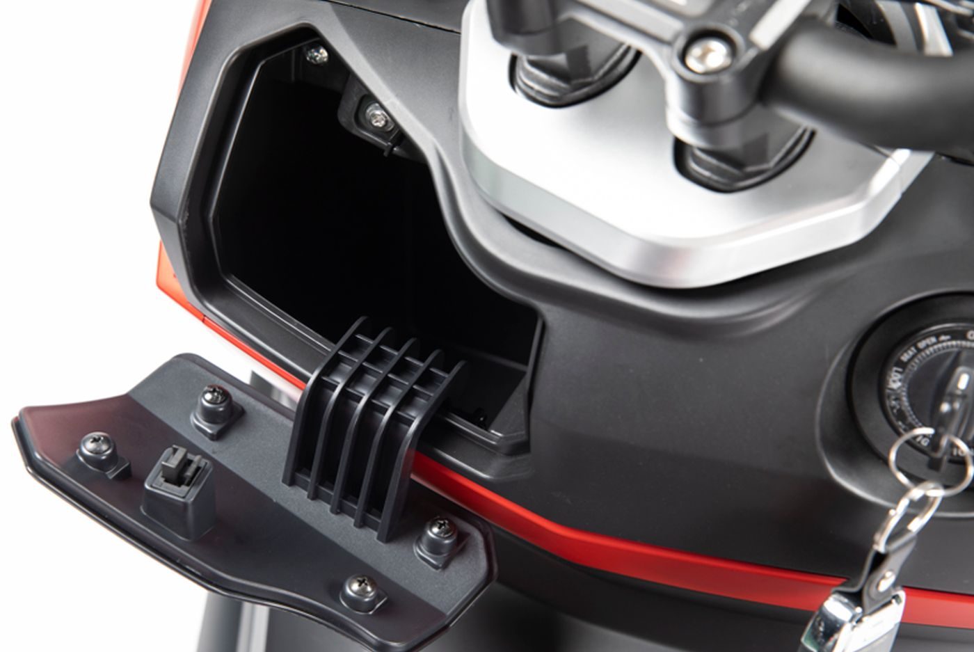 Como era de esperar la dotación no acaba aquí, siendo muy extensa. Me gusta que incorpore de serie una llamativa pantalla digital para la instrumentación. También se agradece la toma de corriente para cargar el móvil, la cúpula frontal, la pata lateral o la guantera tras el escudo. Todo se complementa con una hueco bajo el asiento para dejar un casco y alguna cosa adicional.