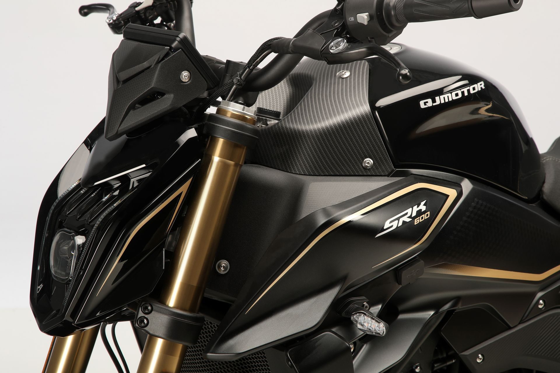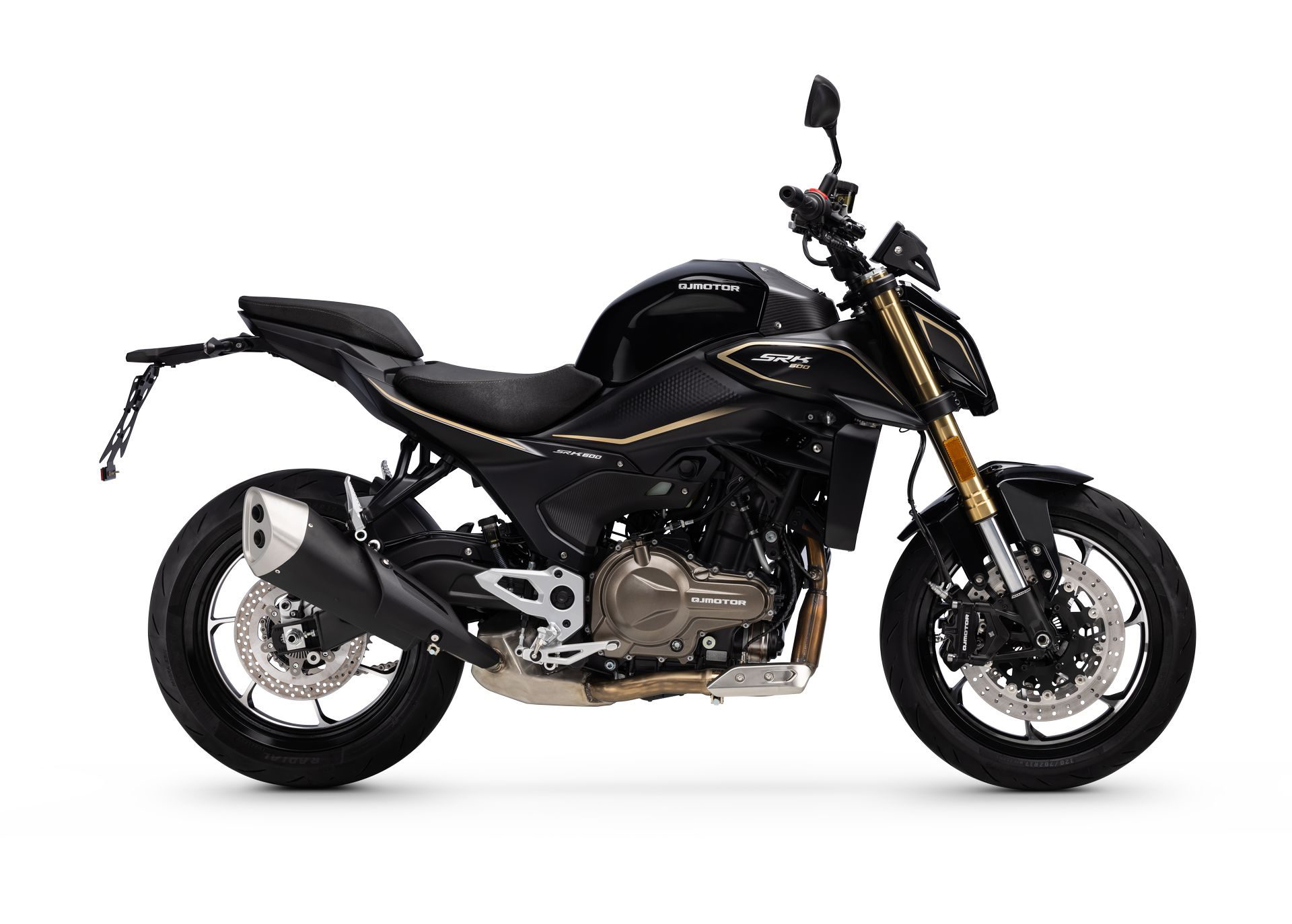 Esa moto es la SRK 600, y es el último lanzamiento en España de la marca china QJ Motor. Esta marca (fundada en 1985 como Qianjiang Motorcycles) pertenece a la órbita del gigantesco consorcio que es Geely – propietaria de Lotus o Volvo, sin ir más lejos – y vende en nuestro país una amplísima gama de motos. La SRK 600 es una naked tradicional, con un diseño cuidado y moderno. Su faro LED le da mucha presencia, así como los detalles dorados de sus horquillas o el colín de escape, situado en la parte inferior de la moto.