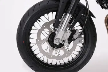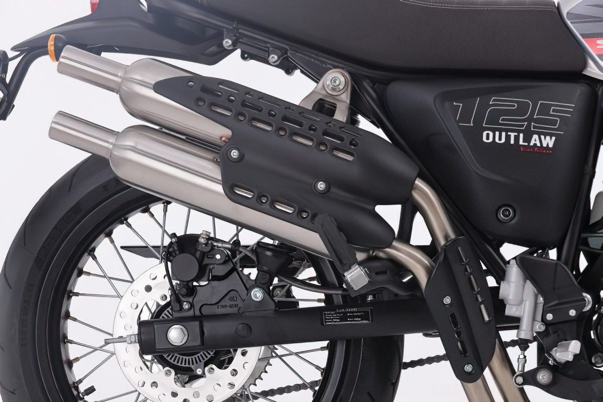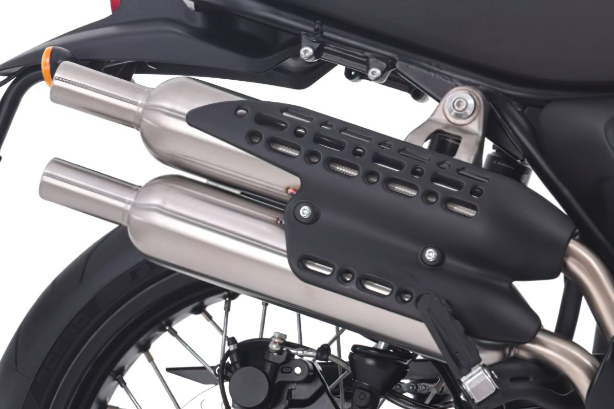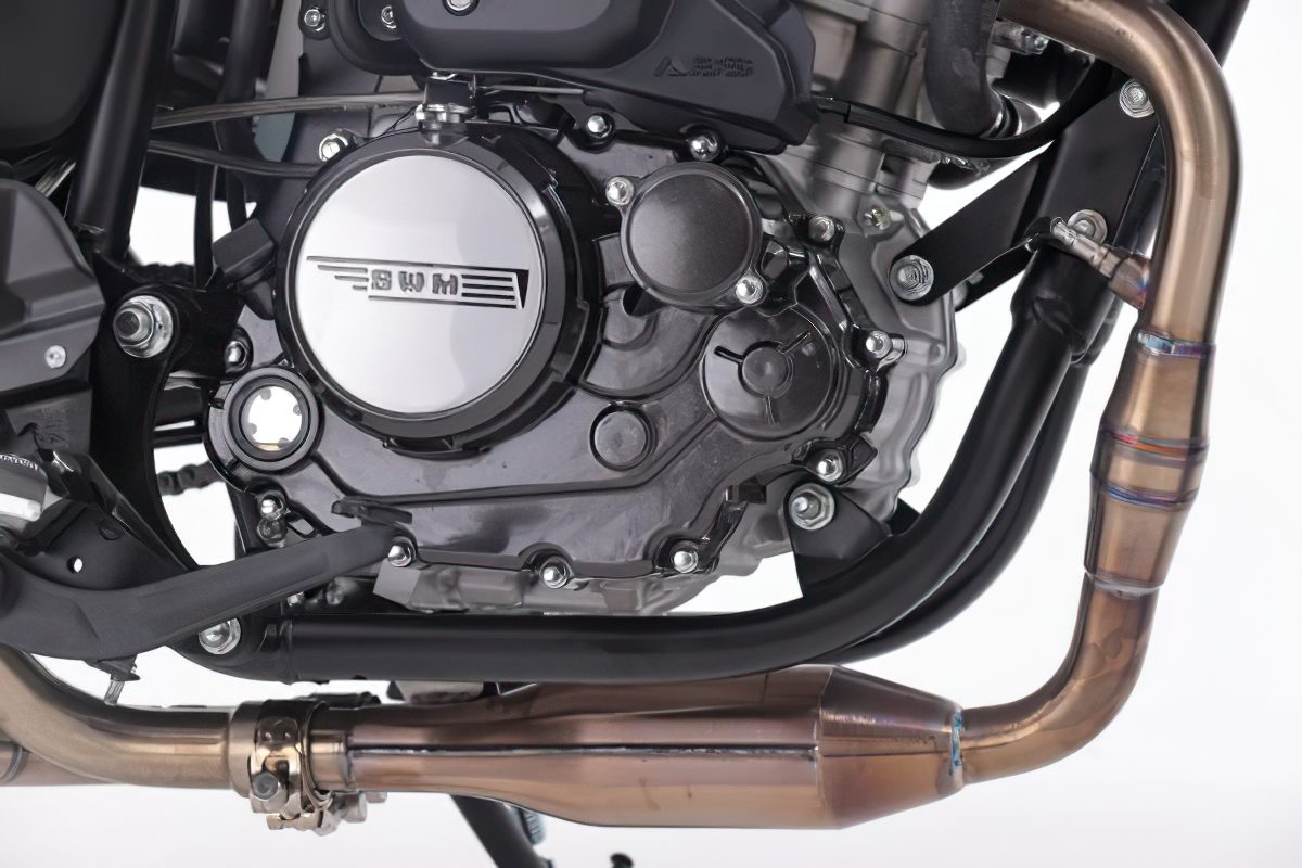 Cuenta con un embrague convencional bañado en aceite, con una caja de cambios de 6 velocidades y transmisión final sellada. El colector de escape pasa bajo el motor y termina dividido en dos atractivos silenciadores elevados, contando con un tratamiento que le da esa tonalidad latón.