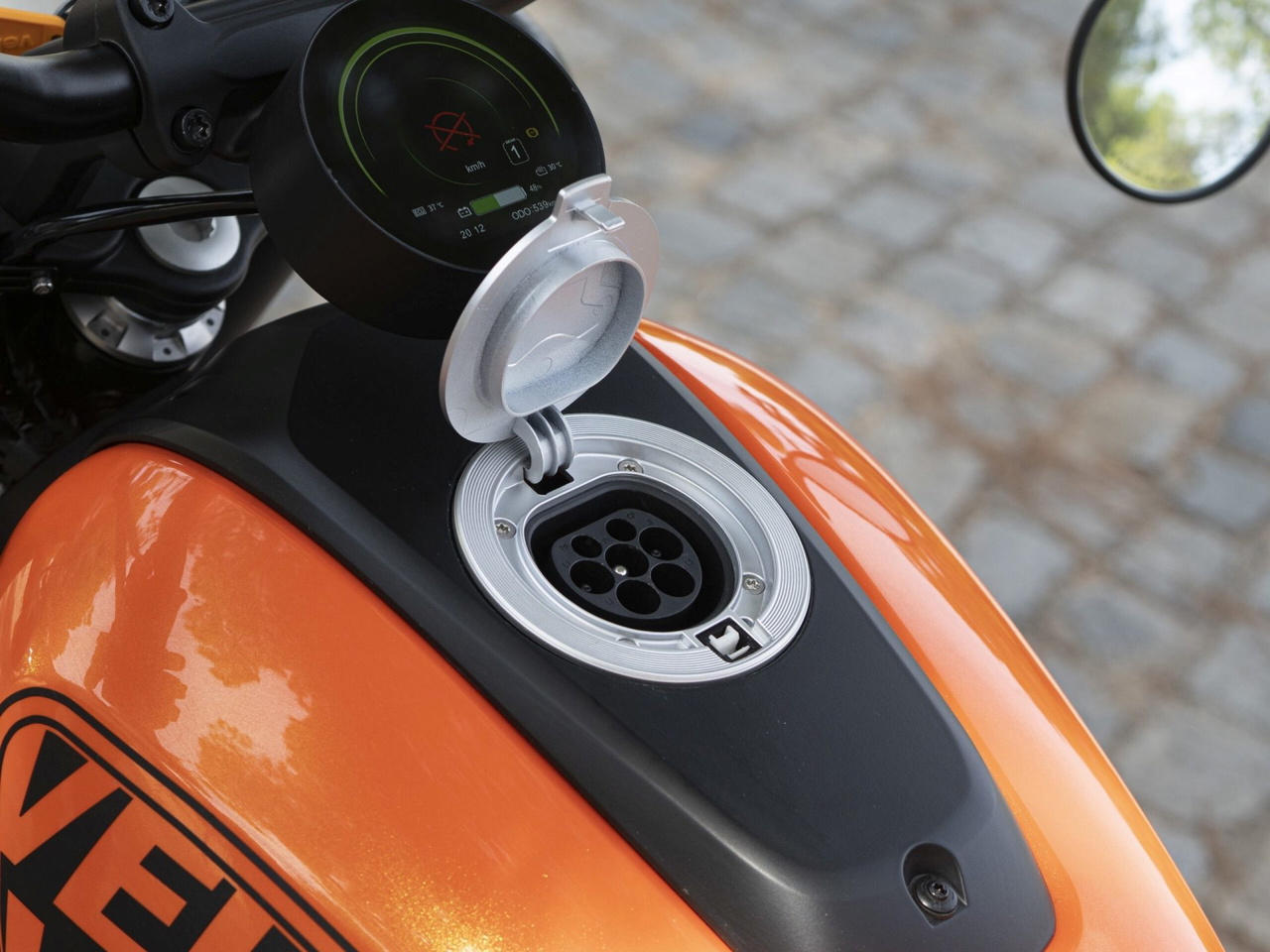 En lo relativo a carga, todo queda en manos de un cargador de abordo de 1,8 kW, con una toma de carga de tipo 2. En este caso, el cargador está integrado en el falso depósito, ya que buscando emular las formas de una moto de gasolina, aquí seguimos encontrando ese característico bulto delante de piloto. Según la marca, para una carga completa necesitará un tiempo total de cuatro horas y media.