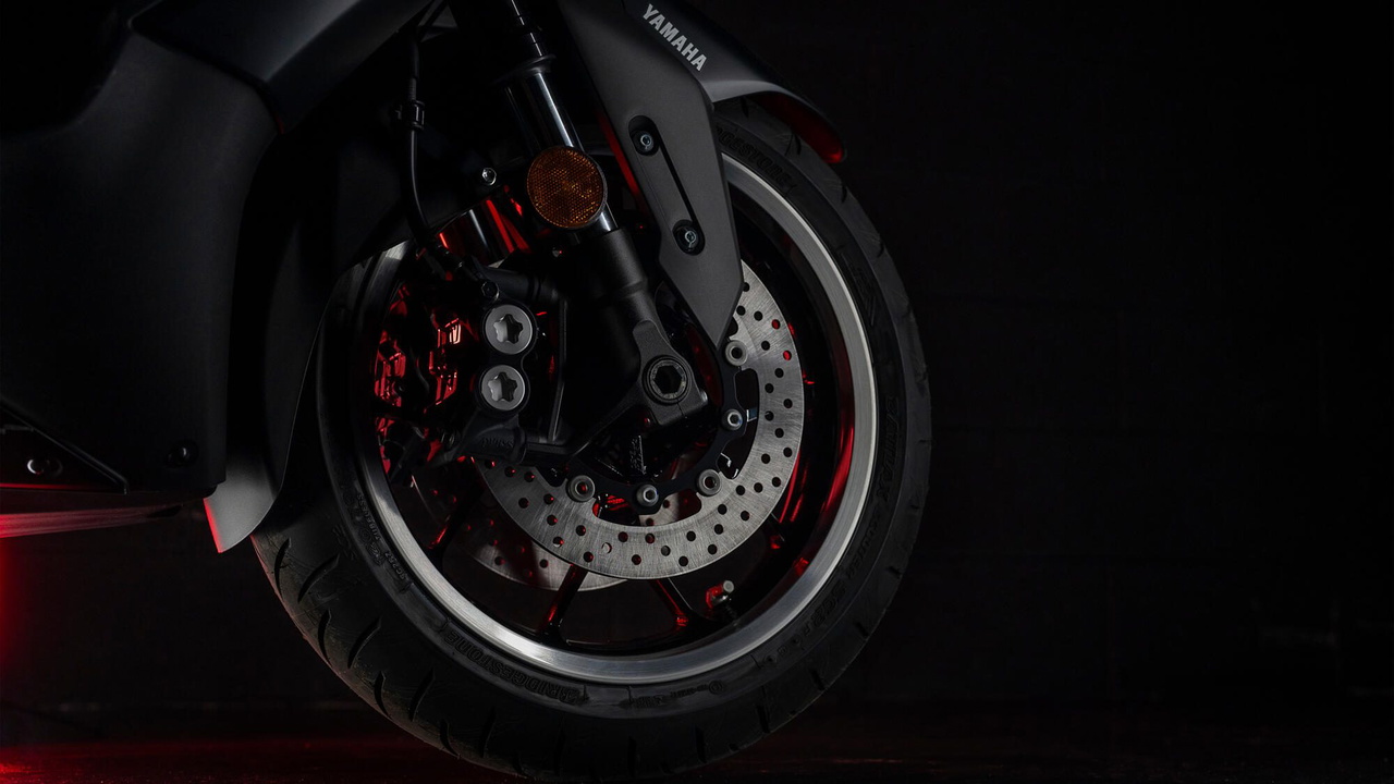 Las llantas forjadas de 15 pulgadas habituales en TMAX dan paso a unas llantas específicas mecanizadas para esta 25 Aniversario, su característica correa dentada, doble disco delantero de 267 mm, freno trasero de 282 mm, y horquilla telescópica.