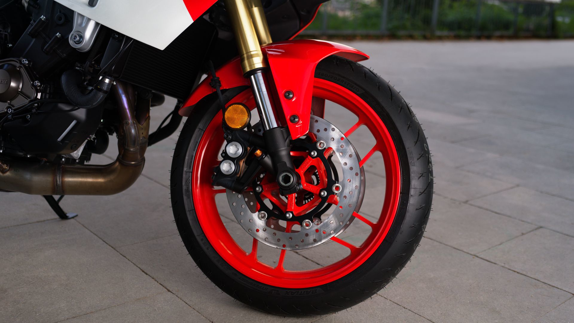 La parte ciclo de la XSR900 GP es muy deportiva, como era de esperar en una moto así. Sus llantas simétricas de 17 pulgadas son ultraligeras, son forjadas y están calzadas de serie con neumáticos Bridgestone Battlax Hypersport S23 que llegan a los 180 mm de sección en el tren trasero. La horquilla delantera es invertida y está firmada por Kayaba. Es completamente ajustable – en precarga, compresión y extensión – al igual que el sistema de bieletas trasero, con monoamortiguador, también de Kayaba.