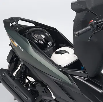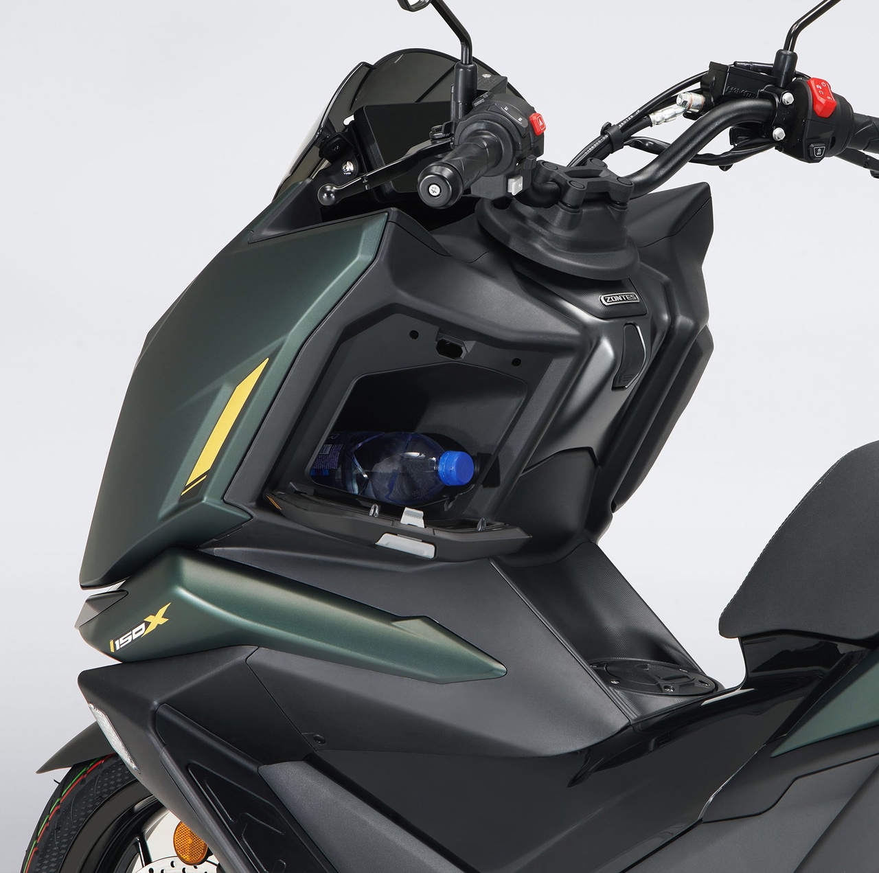 En cuanto a sus soluciones más prácticas, un compartimento bajo el asiento con espacio para dos cascos integrales, dos guanteras frontales generosas con doble toma USB (A y C), gancho portabolsas, iluminación LED integral, instrumentación TFT de 5″ con función Mirroring y app de gestión para el móvil, sistema de arranque Keyless y hasta dos parabrisas intercambiables.
