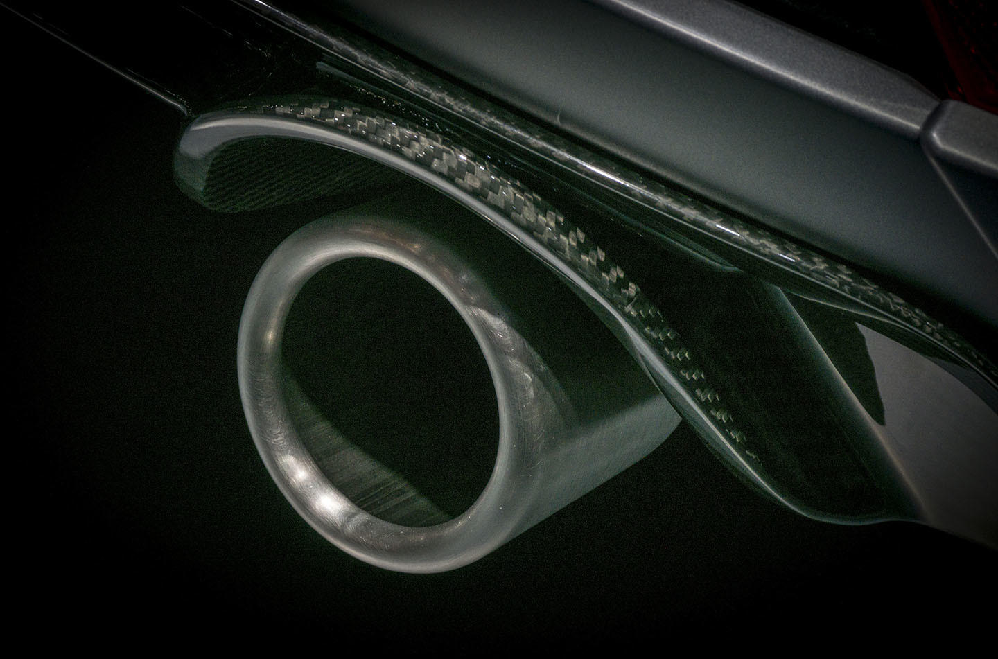 No es habitual encontrar fibra de carbono en un compacto. En el SEAT León Cupra R nos encontramos fibra de carbono en el difusor trasero, que puedes ver en esta imagen de detalle de la salida de escape, pero también en los spoilers delanteros y traseros y en los faldones laterales.