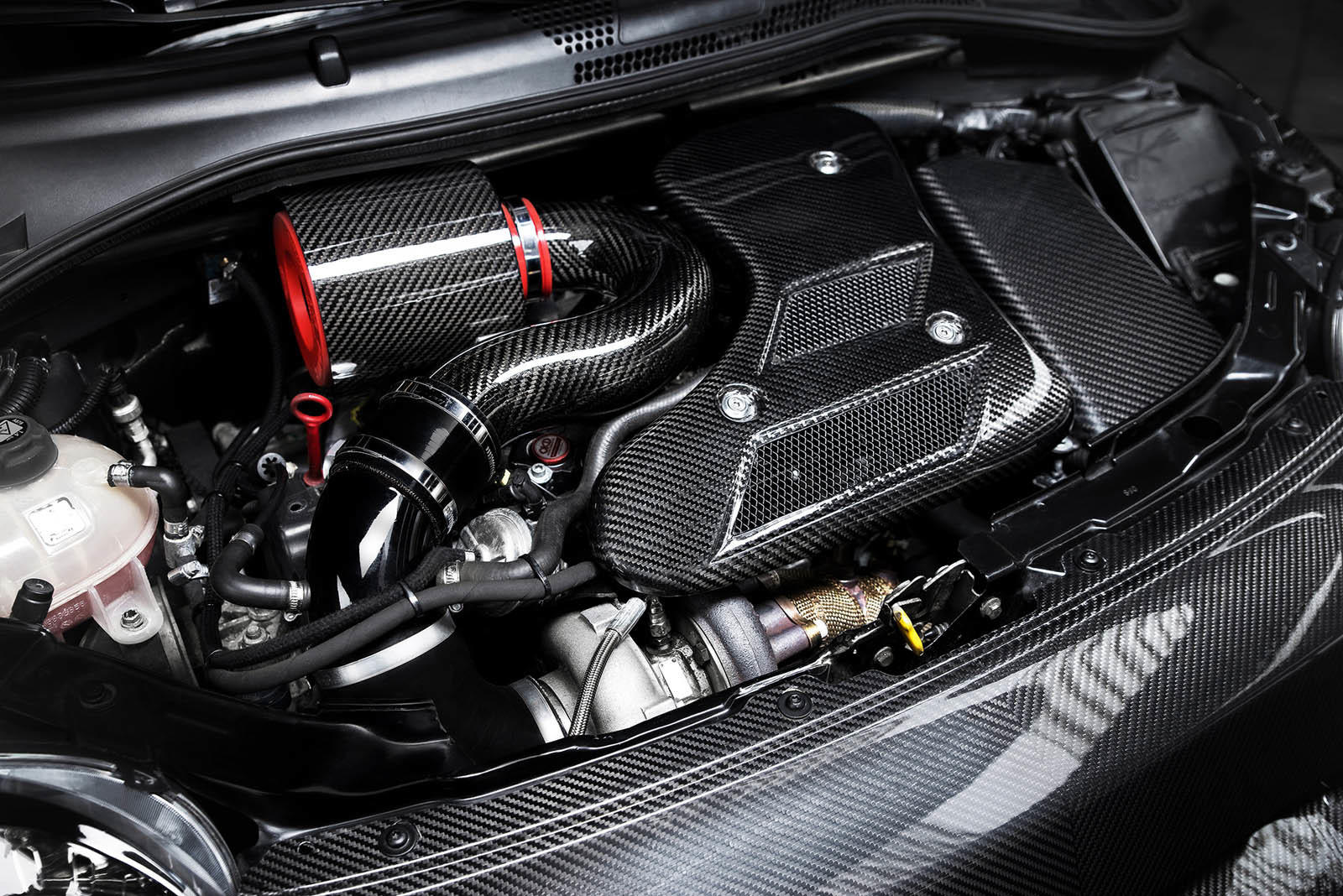 Esta potencia se consigue del pequeño bloque de 4 cilindros y 1.4 litros original aunque obviamente, como estarás imaginando, semejante potencia, 404 caballos, no se consiguen a golpe de electrónica.