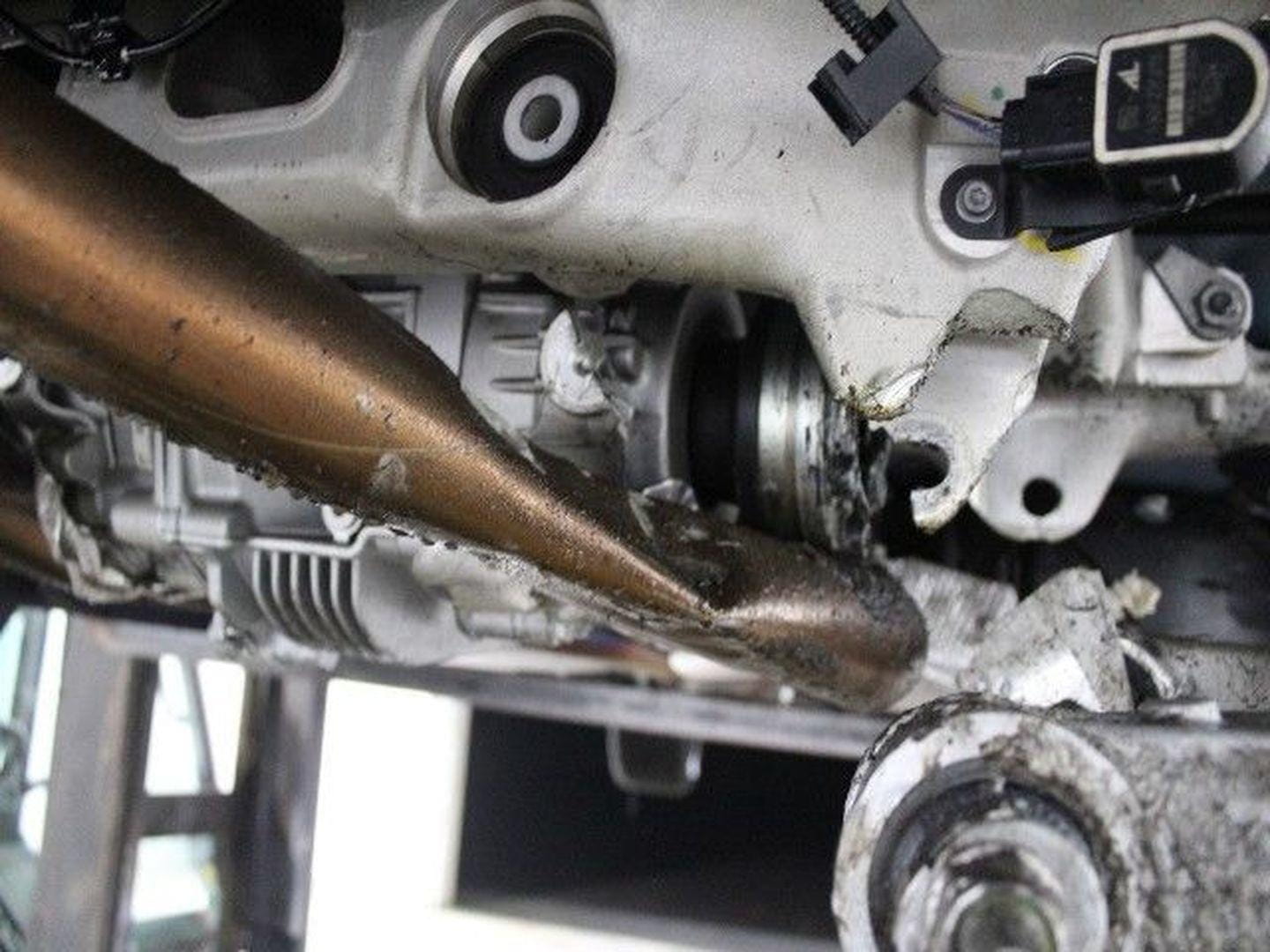 La llanta ha posiblemente fallecido en acto de servicio, y realmente, no me preocupa tanto el impacto recibido por los brazos y palieres traseros, visiblemente afectados por el impacto. Lo que me preocupa es que el chasis se haya doblado. Además de ser una reparación complicada, posiblemente afecte al resto de la vida del coche. Como se suele decir, «el coche no quedará igual que estaba». Los airbag de cortina traseros se han desplegado, y a la carcasa del diferencial trasero le faltan trozos. Puede que haya más sufrimiento en otros puntos del subchasis.