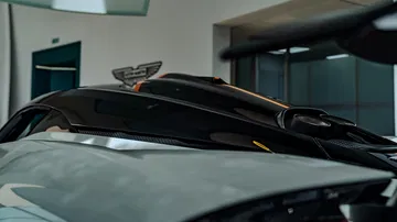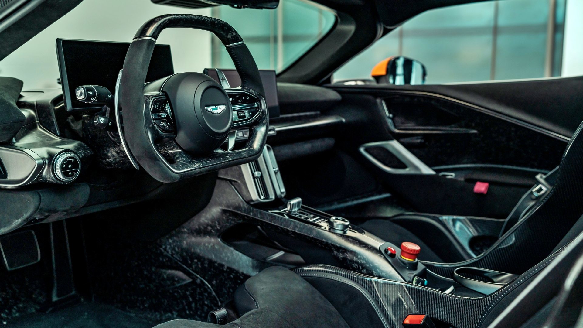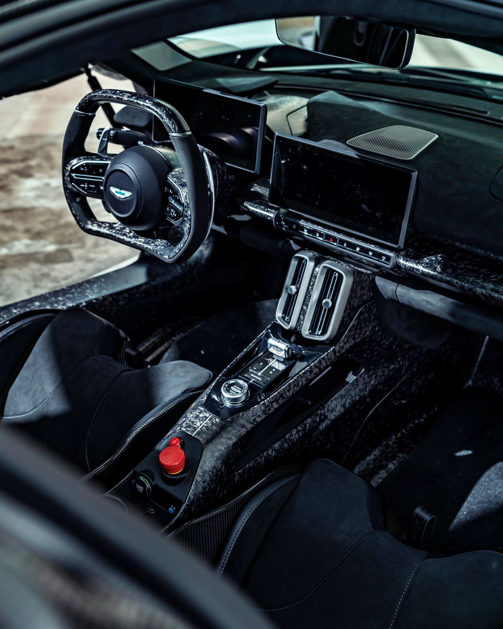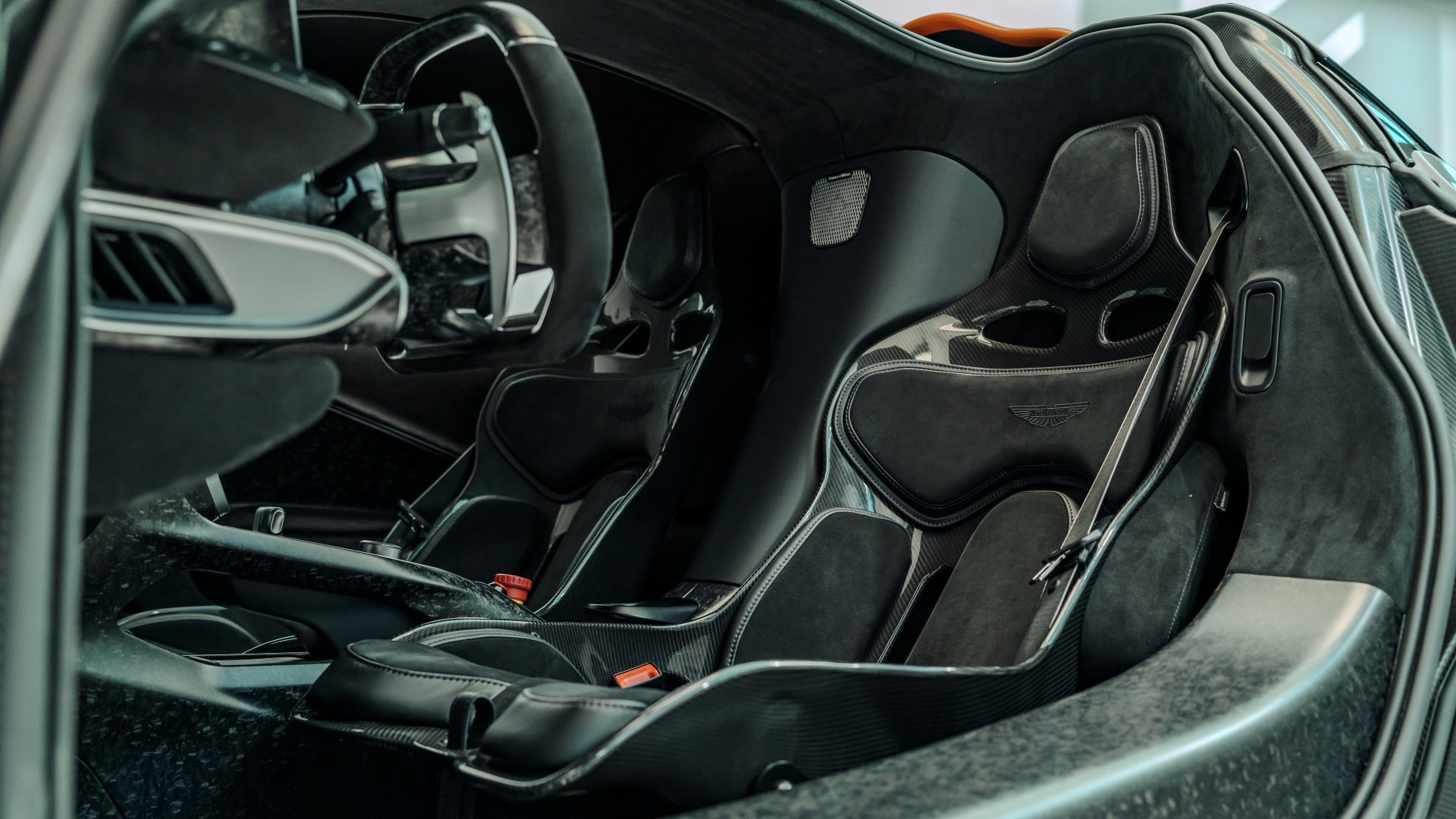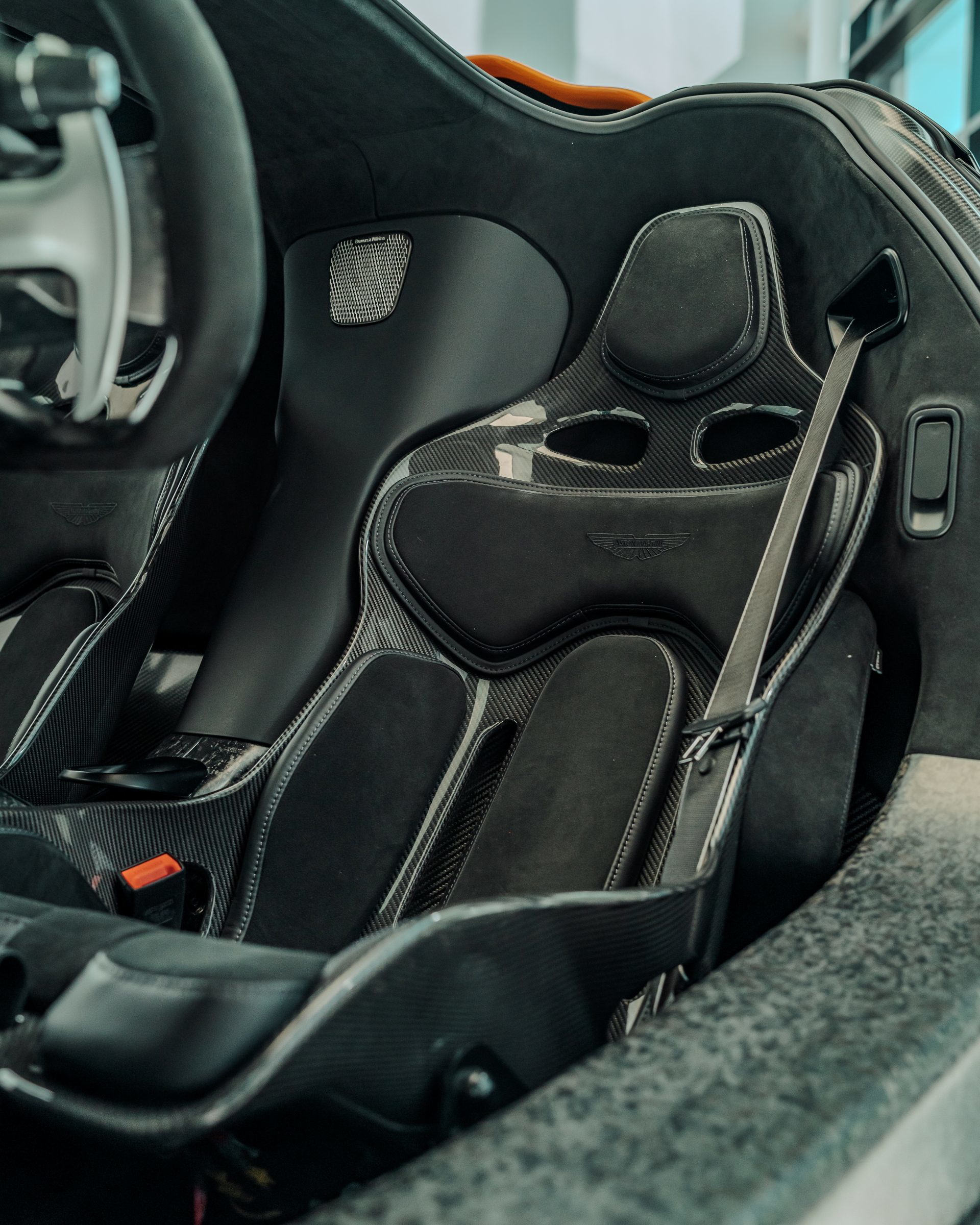 El interior es uno de los puntos donde más evolución se percibe. Fabricado a partir de un chasis monocasco de fibra de carbono, el habitáculo es digno de un coche de carreras, sin embargo la sensación de espacio y confort es notablemente superior frente a lo que podemos encontrar en el Valkyrie. A ello también ayuda el nuevo diseño de puertas con apertura vertical y el mayor espacio libre en el hueco de acceso. El diseño del cockpit es muy ergonómico, sumamente deportivo, pero permite una mejor gestión de todas las funciones, hace más fácil alcanzar una postura óptima de conducción sin importar tu talla y además disfrutamos de mayor visibilidad en todos los ángulos.