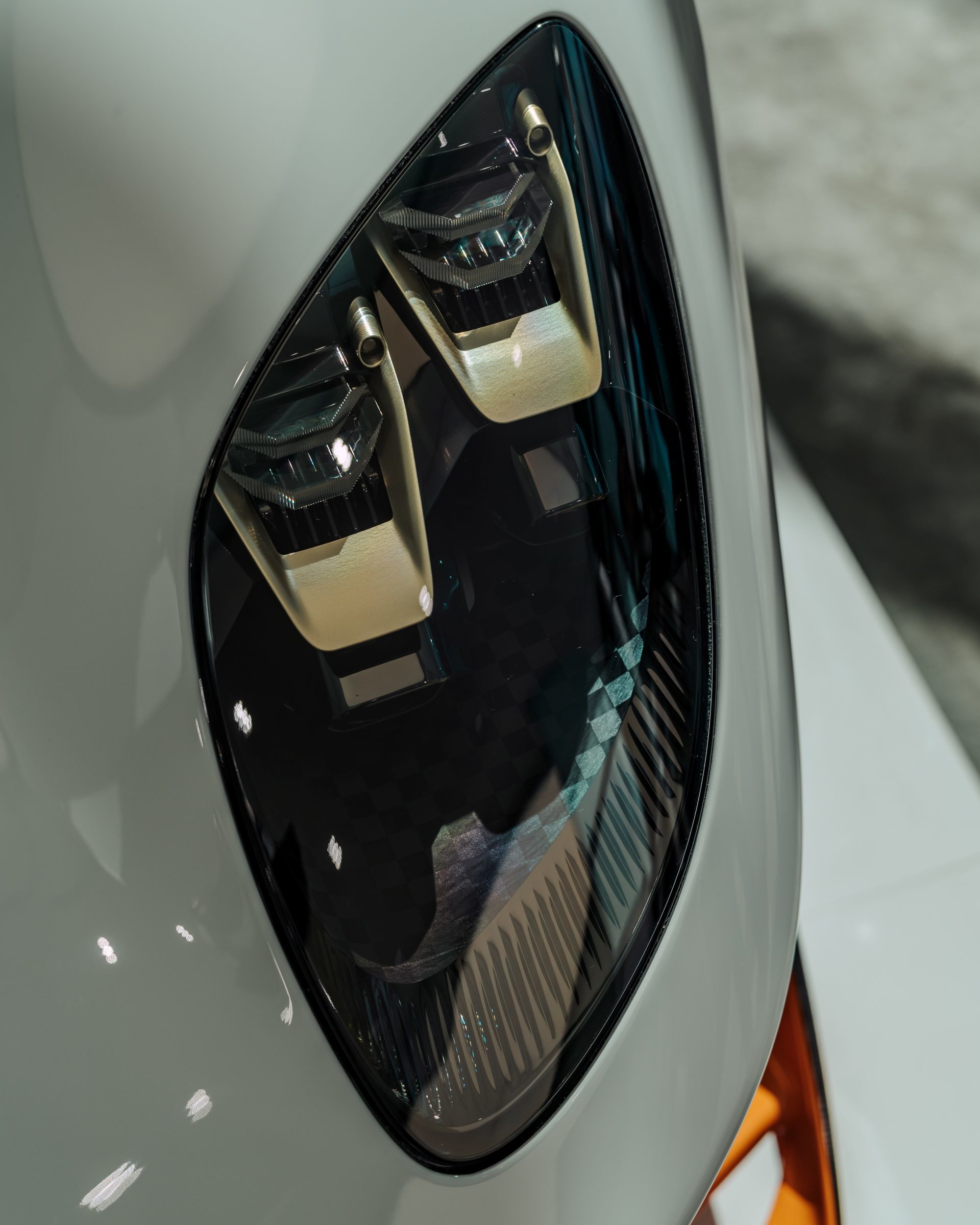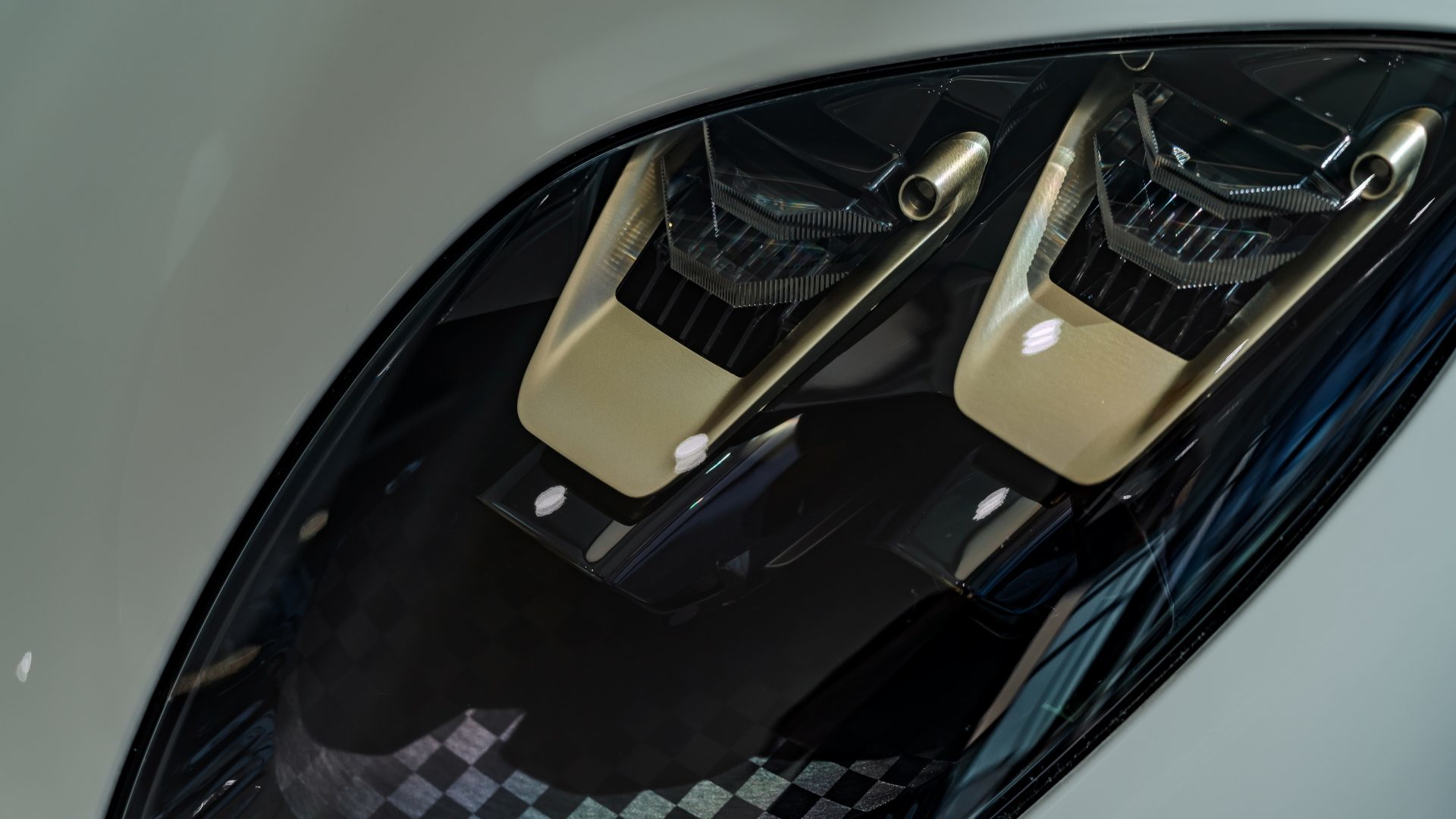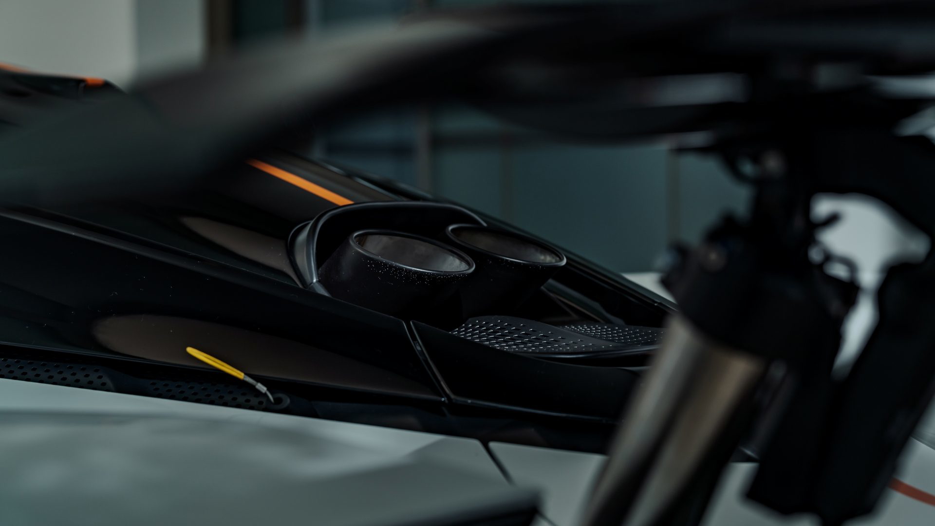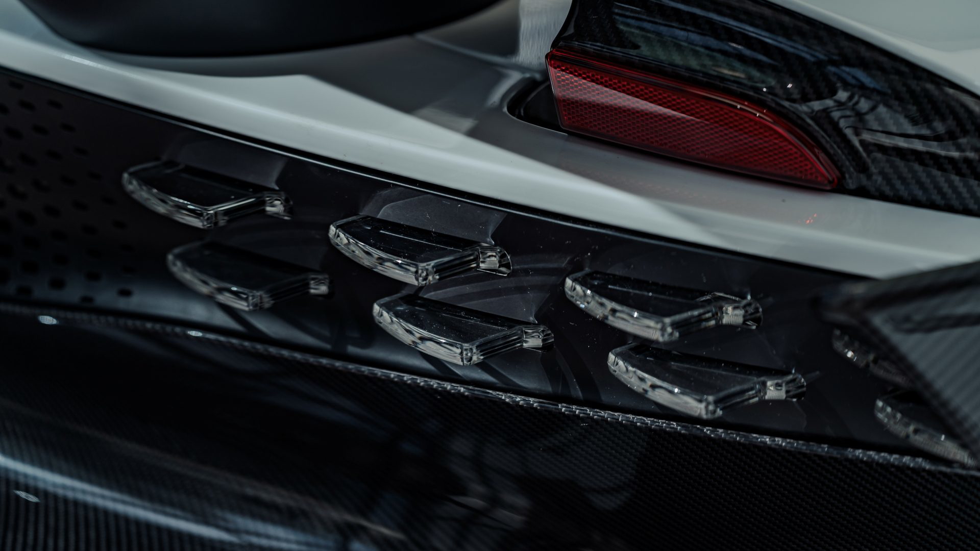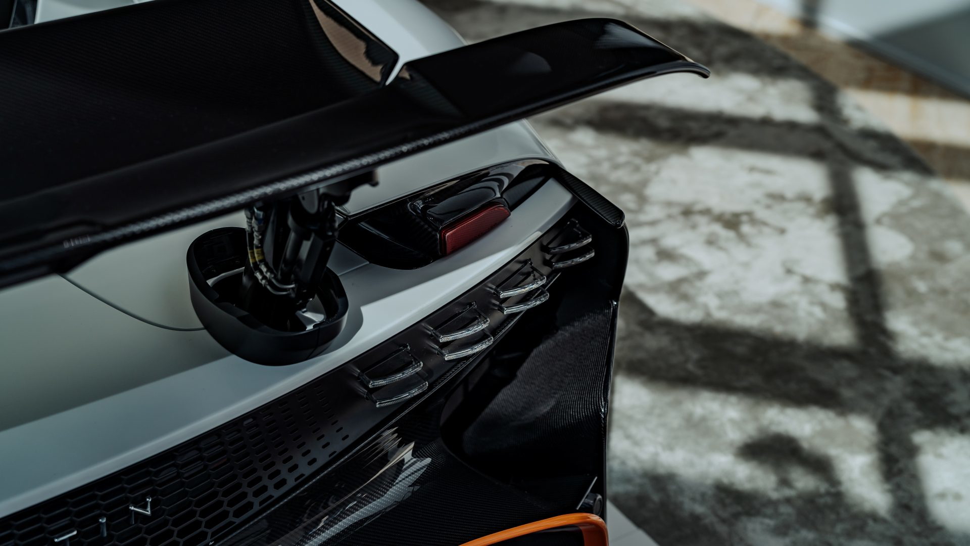 Para empezar tenemos una carrocería esculpida en el túnel de viento para que la aerodinámica sea absoluta protagonista. Cada elemento de la carrocería ha sido estudiado al detalle para conseguir que el Valhalla sea capaz de generar hasta 600 Kg de downforce entre los 240 y 350 Km/h, siendo especialmente culpable el alerón trasero capaz de elevarse 25,5 cm y alterar su inclinación en función del modo de conducción activado. Este alerón además se combina con unos flaps móviles ocultos en el frontal, actuando de igual modo para modificar la carga aerodinámica.