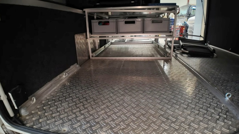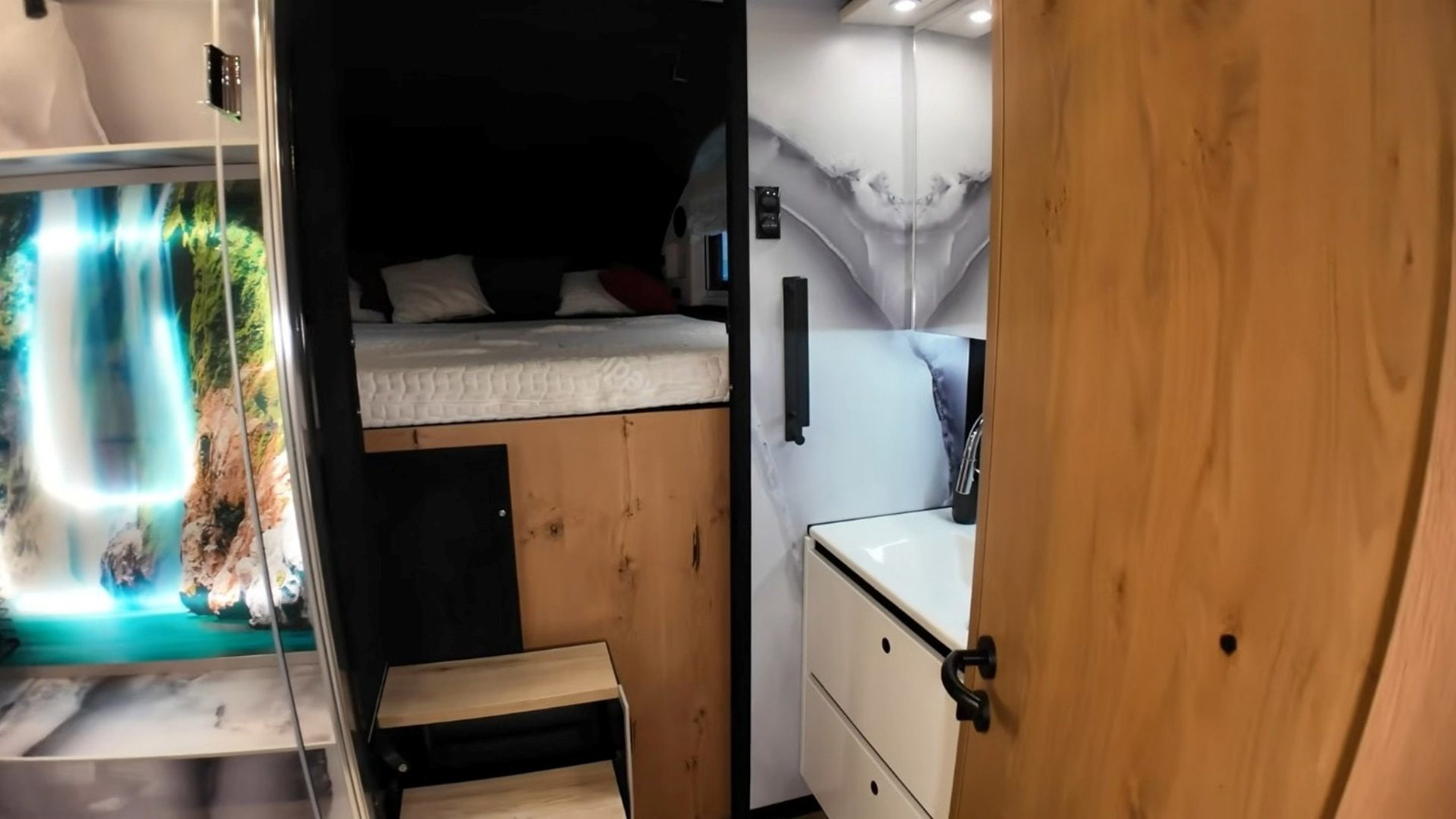 La cocina es, directamente, descomunal. La configuración de tipo slide-out permite montar dos bloques bien diferenciados y moverse con comodidad. En el principal hay fregadero grande de acero inoxidable, placa de inducción de cuatro fuegos con campana integrada, frigorífico Bosch, horno amplio con microondas y mucho almacenaje. Enfrente, más superficie de trabajo con encimera de granito natural, despensa completa con bandejas deslizantes, un especiero e incluso lavavajillas. El comedor está elevado en la parte trasera, con un banco en L alrededor de una mesa de madera regulable y una Smart TV de 40 pulgadas que se esconde cuando no se usa, acompañada de un sistema de sonido firmado por Audiotec Fischer. En confort climático tampoco se queda corta: aire acondicionado residencial Samsung y calefacción diésel-eléctrica por suelo radiante en toda la autocaravana.
