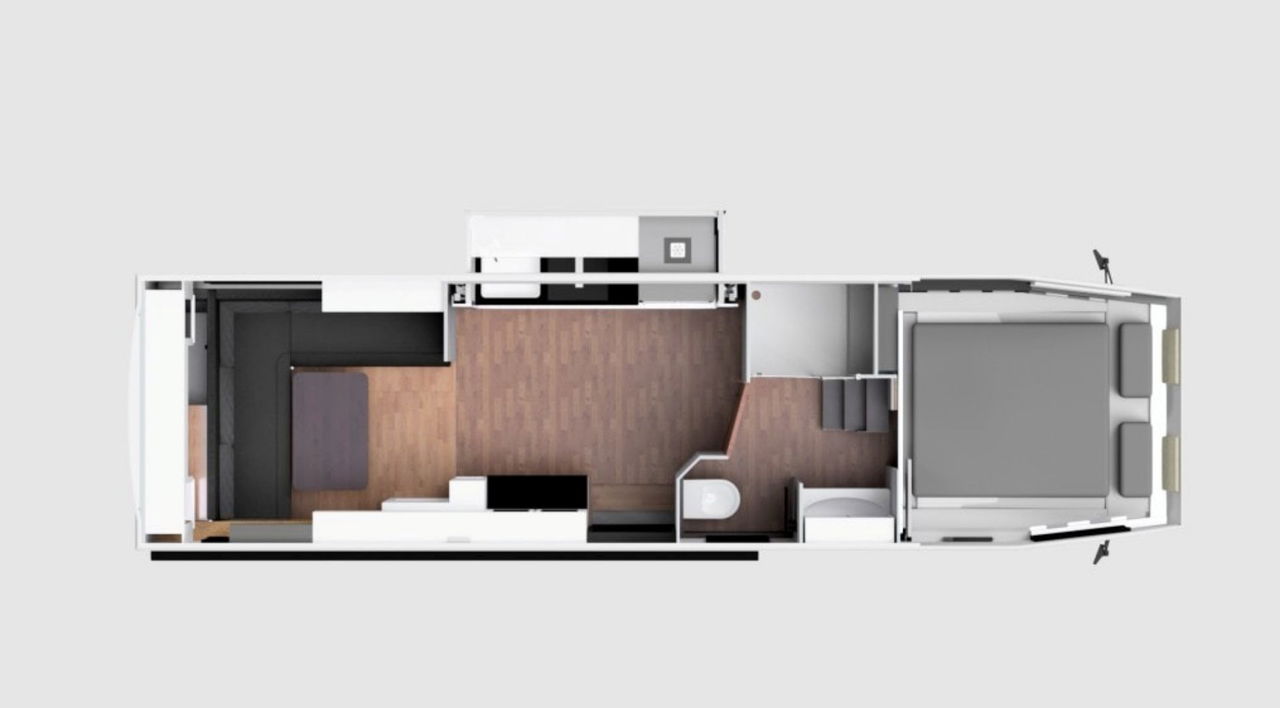 El resto de la ATventure 960 no es menos destacable, pues no se andan con medias tintas. Pueden dormir hasta cuatro personas y llevar cinco en marcha gracias a la cabina XL, todo con espacio de sobra y un nivel de confort claramente por encima de cualquier camper y por encima de la media entre las de su tipo. El dormitorio va en la parte delantera, sobre la cabina, con una cama fija que se eleva eléctricamente hasta el techo para liberar paso entre la vivienda y el puesto de conducción. Con la cama bajada, ambos espacios quedan totalmente separados. Detrás se sitúa el salón-comedor, mientras que cocina y baño ocupan la zona central.
