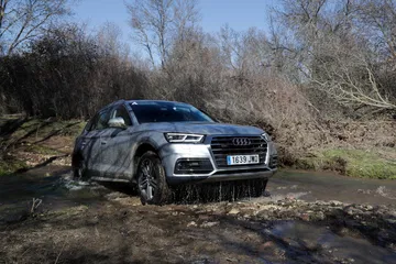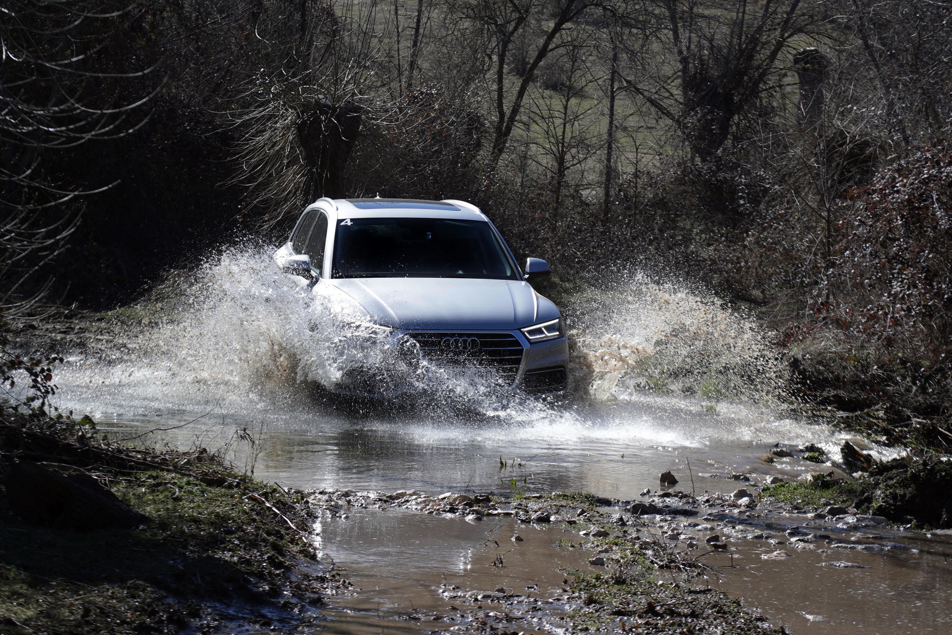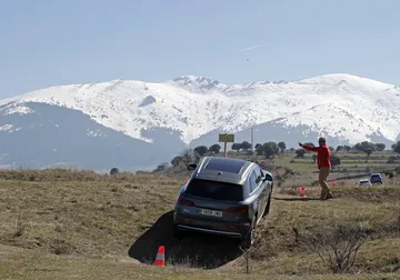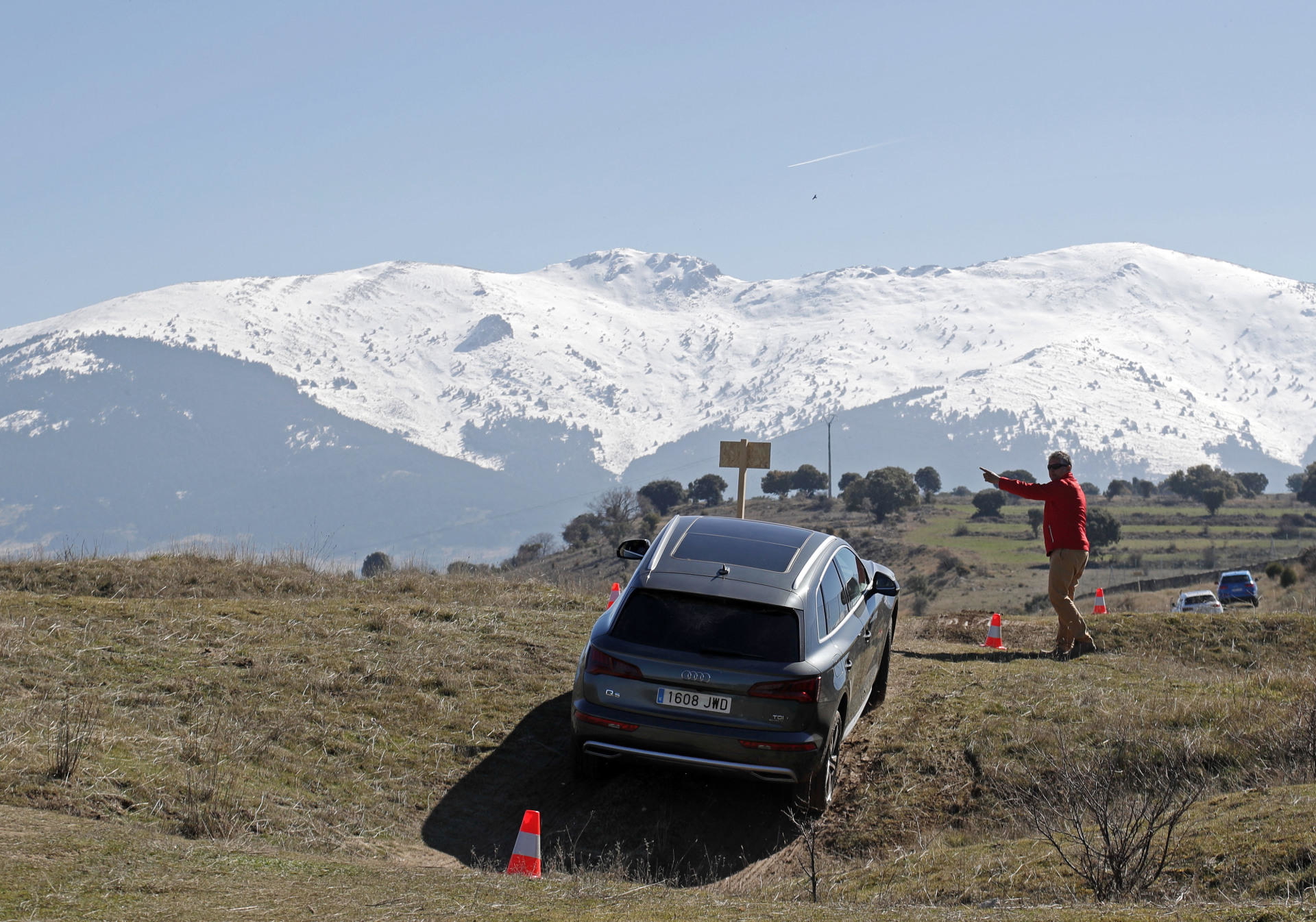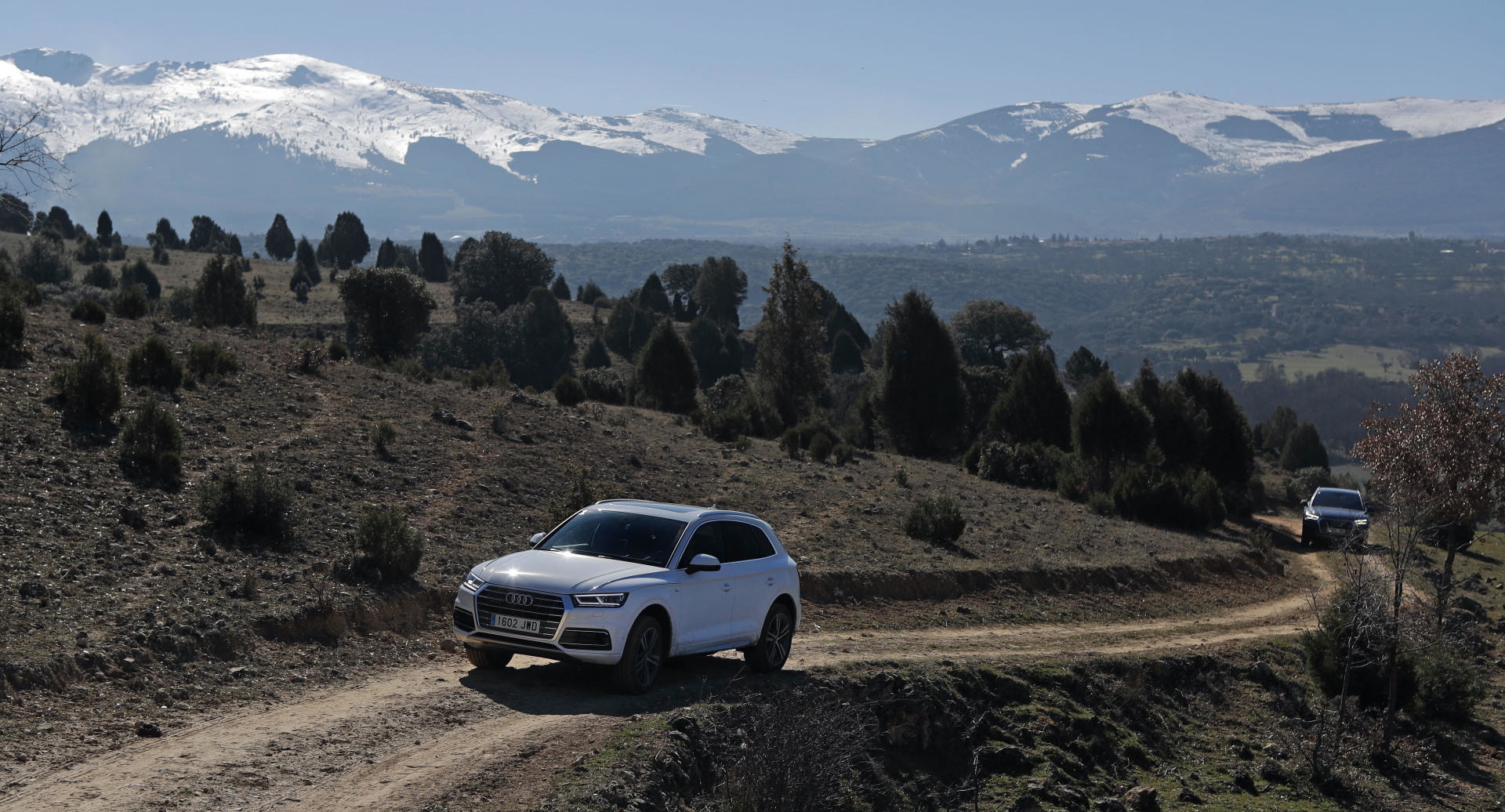 Empezamos a subir el puerto de Navacerrada. Dinámicamente este nuevo Audi Q5 se comporta muy bien. Frena muy bien, de manera eficaz y muy precisa y se siente ágil en su paso por curva, se nota ligero y tiene mucho aplomo. Esos 90 kilos que ha adelgazado se notan. Sin embargo, el 2.0 TDI 190cv se me antoja algo flojo en salida de curva y en adelantamientos en este tramo de montaña. Tras varios kilómetros por carreteras secundarias y alguna parada para hacer fotos llegamos al tramo off road que nos tiene preparado Audi.