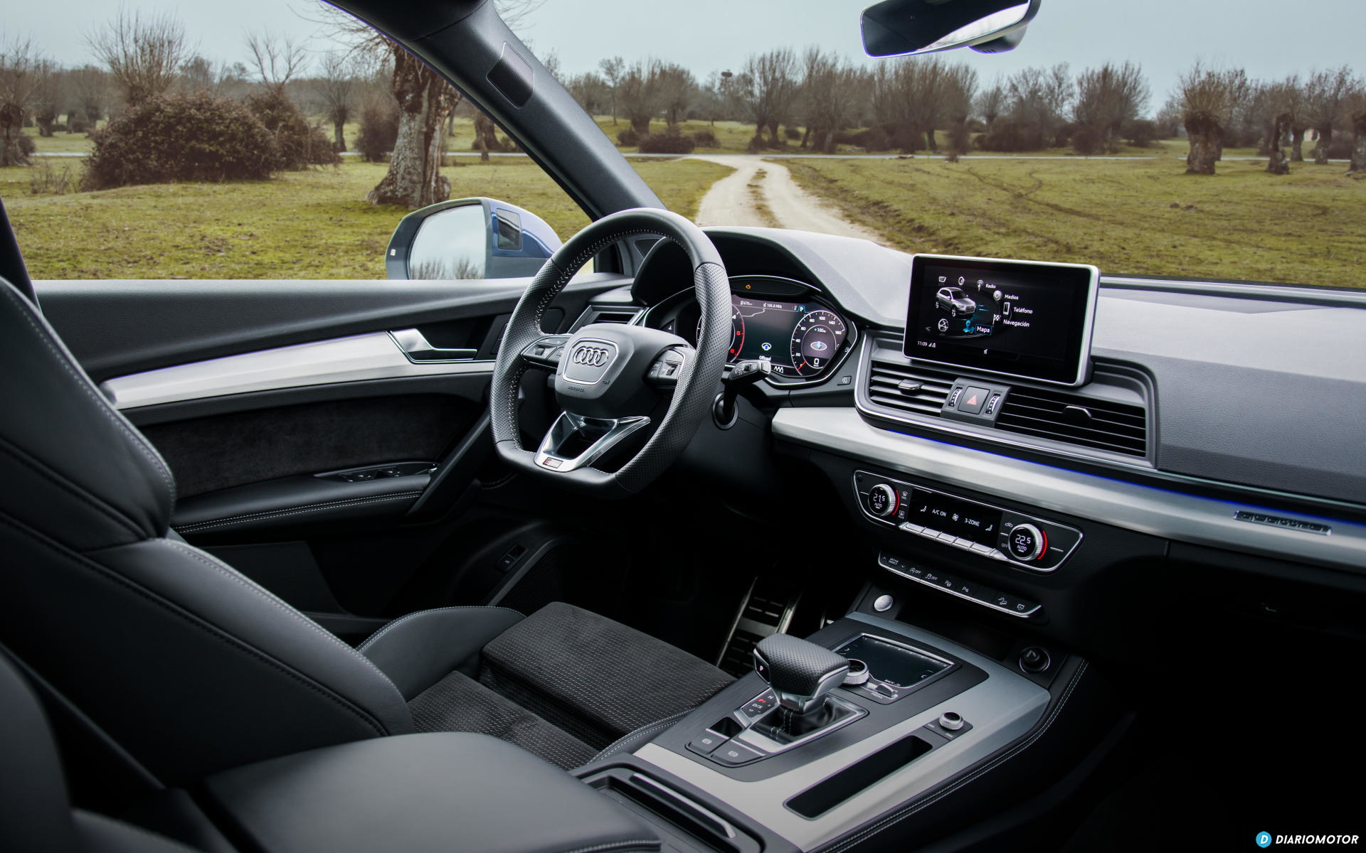 Después de observar su maletero paso al habitáculo. Días antes de esta presentación había leído quejas sobre la efectividad del cierre de las puertas, que había que aplicar demasiada fuerza para que cerraran con efectividad. He de decir que a mí no me pareció para tanto, es cierto que se notan más ligeras pero, excepto que las dejes caer, se cierran sin problemas. Una vez dentro del nuevo Q5 nos encontramos con un interior ya conocido y con una calidad de acabados excelente. Mi vista va directa al Audi virtual cockpit (opcional), menuda maravilla (y mira que yo siempre he defendido a la instrumentación analógica). El volante de tres radios multifunción le da un toque deportivo a este SUV de Audi y en general todo el salpicadero tiene un diseño limpio y elegante. Digo en general porque hay algo en este salpicadero que no me termina de cuadrar, me refiero a la pantalla MMI de 8,3 pulgadas que, bajo mi punto de vista, no termina de integrarse bien con el resto del diseño interior. Empiezo a tocar todo el salpicadero para comprobar la calidad de los ajustes. Sobresaliente.