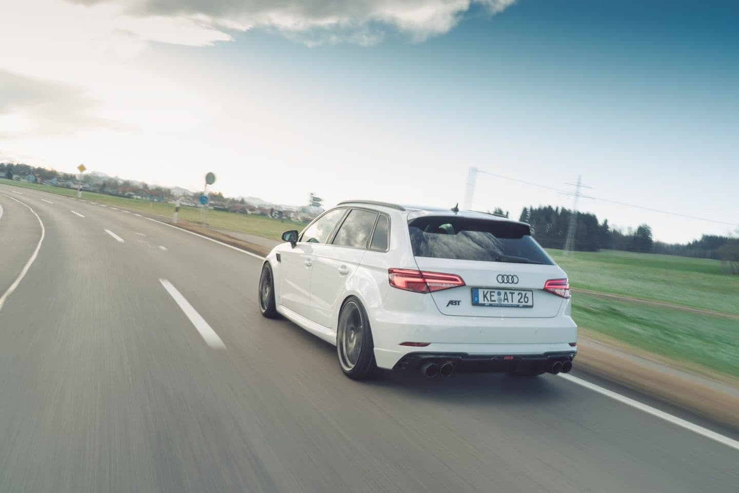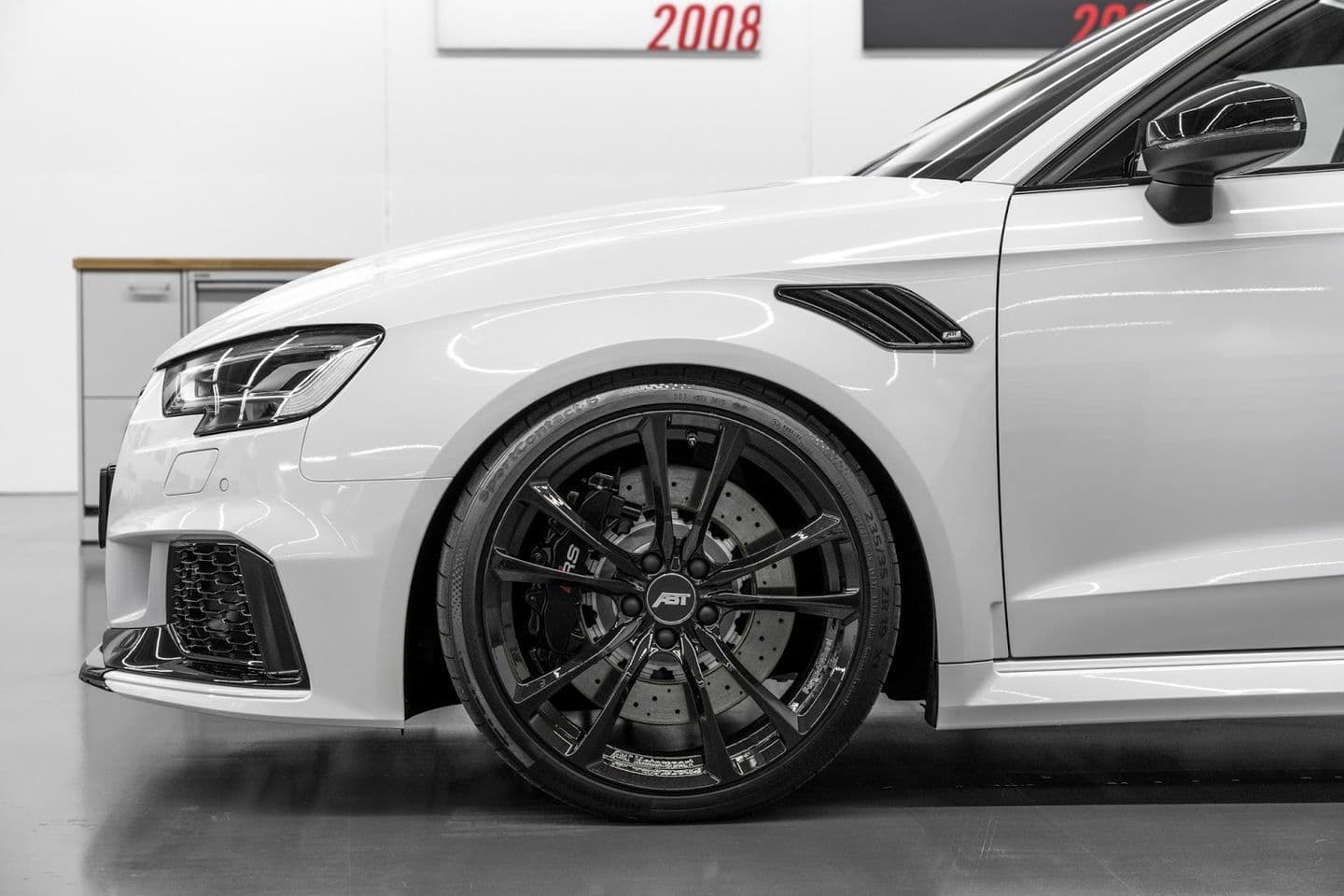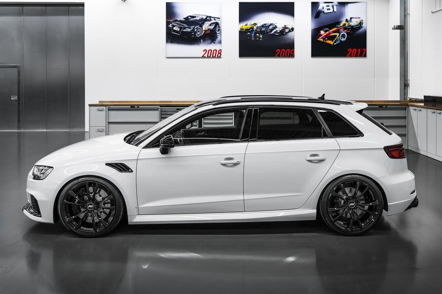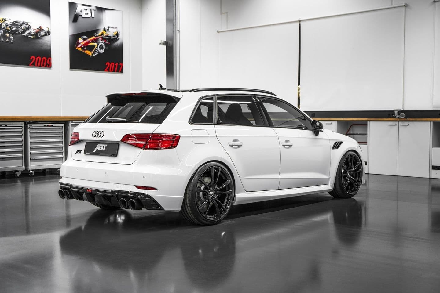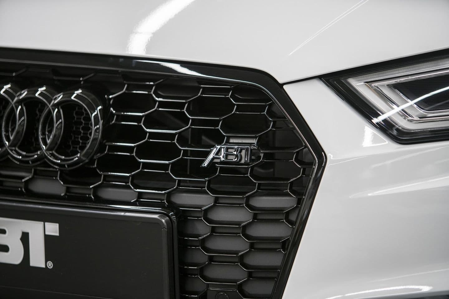 ABT ha instalado unas barras estabilizadoras más gruesas, así como muelles más firmes en los amortiguadores. El equipo de frenado también ha sido retocado, con discos delanteros de hasta 380 mm de diámetro. Por último, no podemos olvidarnos de los cambios en la estética del compacto de Ingolstadt. Sus llantas son ahora unas ABT Sport FR20 de color negro, envueltas en neumáticos de medidas 235/30 ZR20. En el frontal se ha instalado un nuevo labio aerodinámico y una nueva calandra, mientras que en la parte trasera el preparador ha modificado la parte inferior del paragolpes y el difusor aerodinámico.
