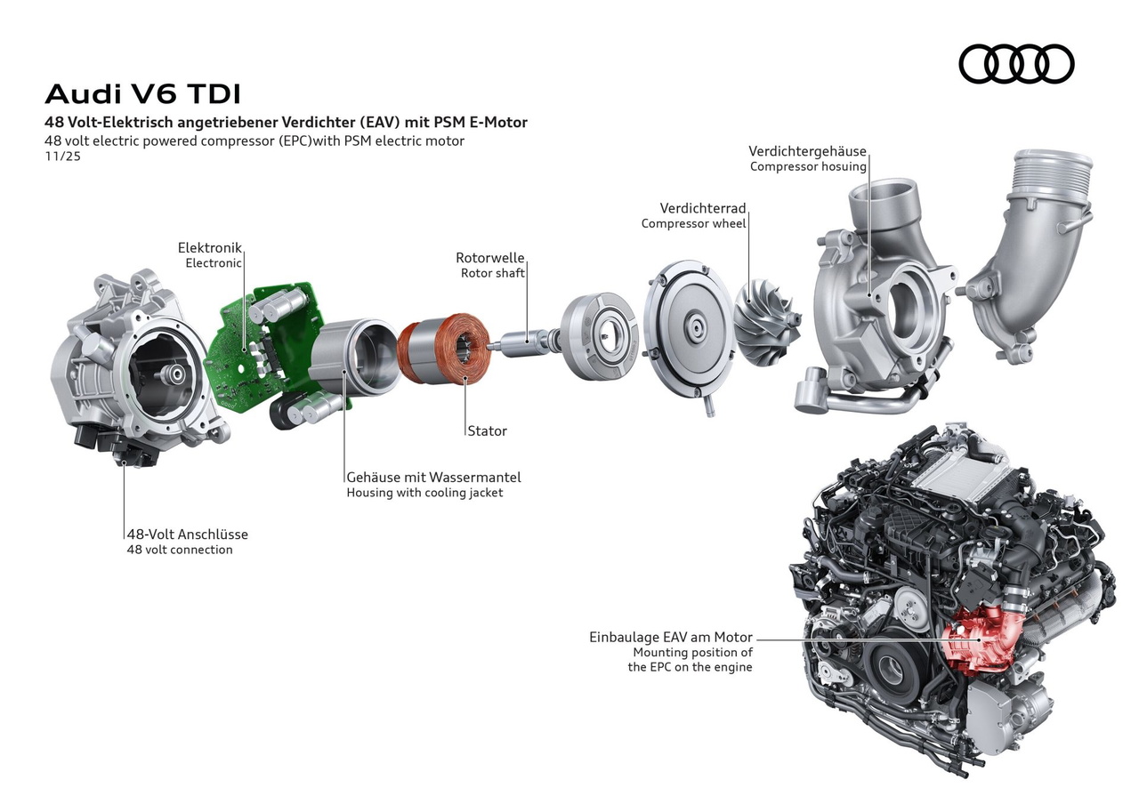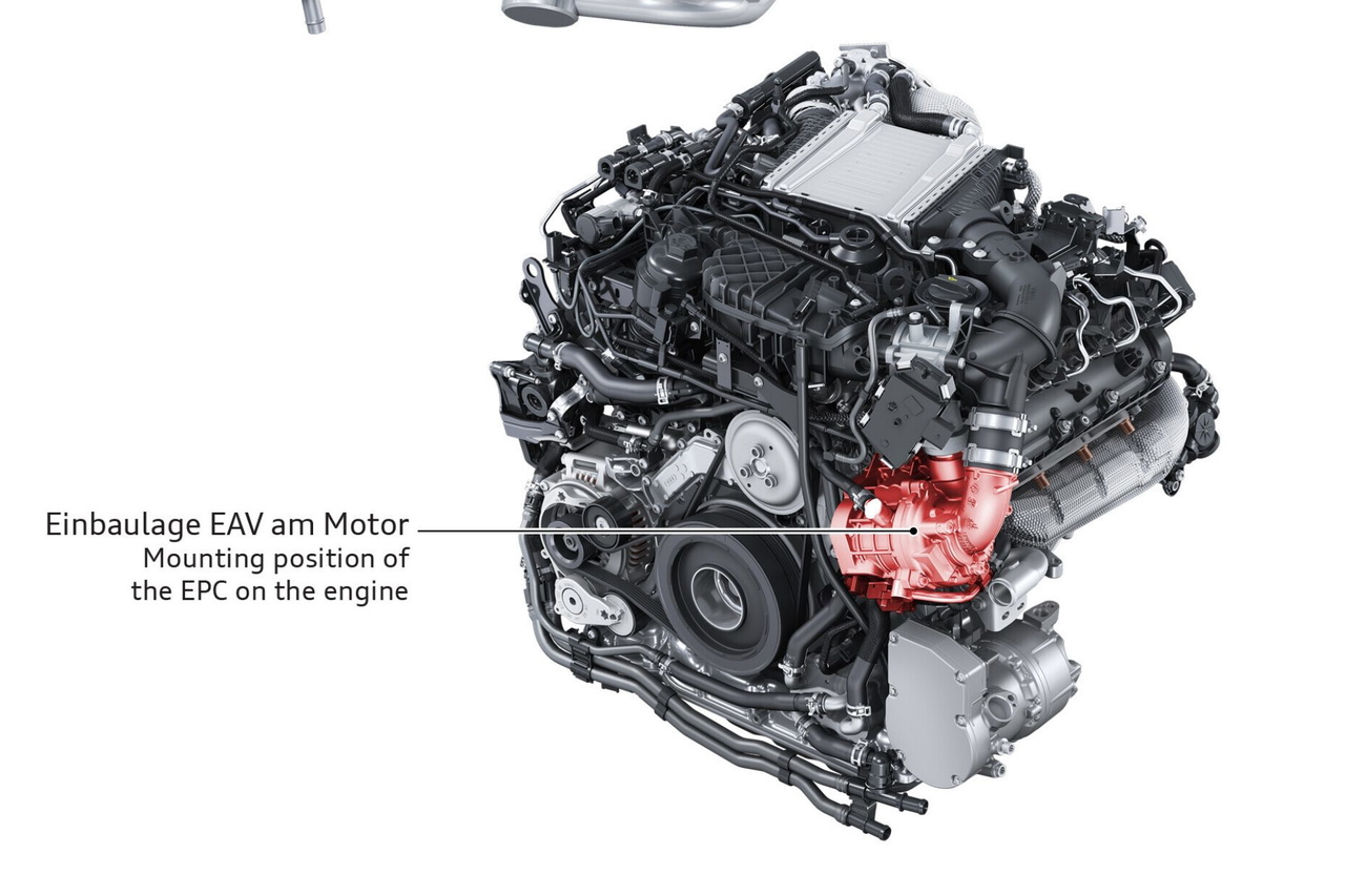 Y es que esta es la gran novedad del motor: la introducción de un compresor eléctrico que funciona en todo el rango de revoluciones y que encaja dentro de un concepto de sobrealimentación de dos etapas junto al turbo convencional. La presión máxima de soplado alcanza los 3,6 bar, y el tiempo para generar presión se reduce casi en un segundo frente al sistema previo. Además, este compresor está situado detrás del turbocompresor y del intercooler, en el propio conducto de admisión, y alimentado por la red de 48 V. Según Audi, supone una mejora del 40% en la aceleración del rotor respecto a los compresores usados en modelos como los S4, S6 o SQ5.