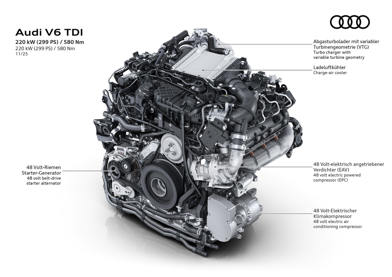 A decir verdad, no se trata de un bloque completamente nuevo, sino una evolición del V6 TDI que venían comercializando hasta la fecha en estos últimos años. Lo que han hecho los alemanes, esencialmente, es cambiar por completo la arquitectura auxiliar del bloque para convertirlo en el nuevo V6 3.0 TDI MHEV plus, o más formalmente, V6 TDI EA897 evo4. Hablamos de un motor que ahora desarrolla 220 kW (299 CV) y un generoso par de 580 Nm, pero que además puede sumar hasta 18 kW (24 CV) y 230 Nm gracias al generador del sistema de propulsión (PTG). Con esto, el conjunto no solo gana fuerza a bajo régimen, sino que responde con una inmediatez inédita hasta ahora en un TDI, apoyado también por un compresor eléctrico de nueva generación capaz de girar a 90.000 rpm en apenas 250 milisegundos.