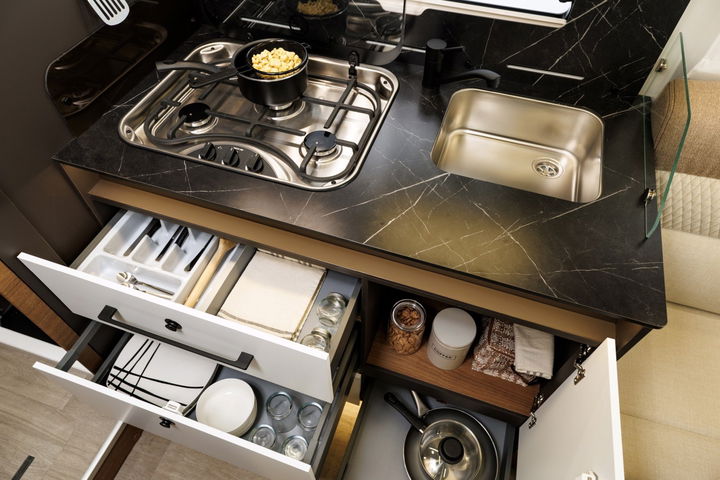 Otro punto destacable de la Benimar Mileo 297 está en su completa cocina de elegante diseño y encimera espaciosa. Además de utilizar materiales ligeros de gran calidad, incluye un interesante fregadero «bajo encimera» de buen tamaño, grifo alto y una cocina de dos fuegos muy práctica al tener buena distancia entre ellos (tener tres fuegos no sirve de mucho si no hay sitio).
