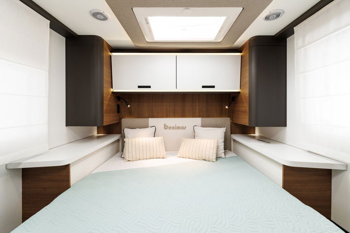 La principal característica de la Benimar Mileo 297 está en su interesante configuración interior con salón enfrentado y cama posterior en isla. Esta enorme cama trasera tiene unas dimensiones de 150 x 195 cm y además se puede regular en altura para ampliar la capacidad del garaje si fuera necesario (puedes meter un par de bicicletas e incluso un moto pequeña). En el salón también hay una cama que baja del techo que mide 1,91 de largo y tiene ancho variable 140/120 cm.