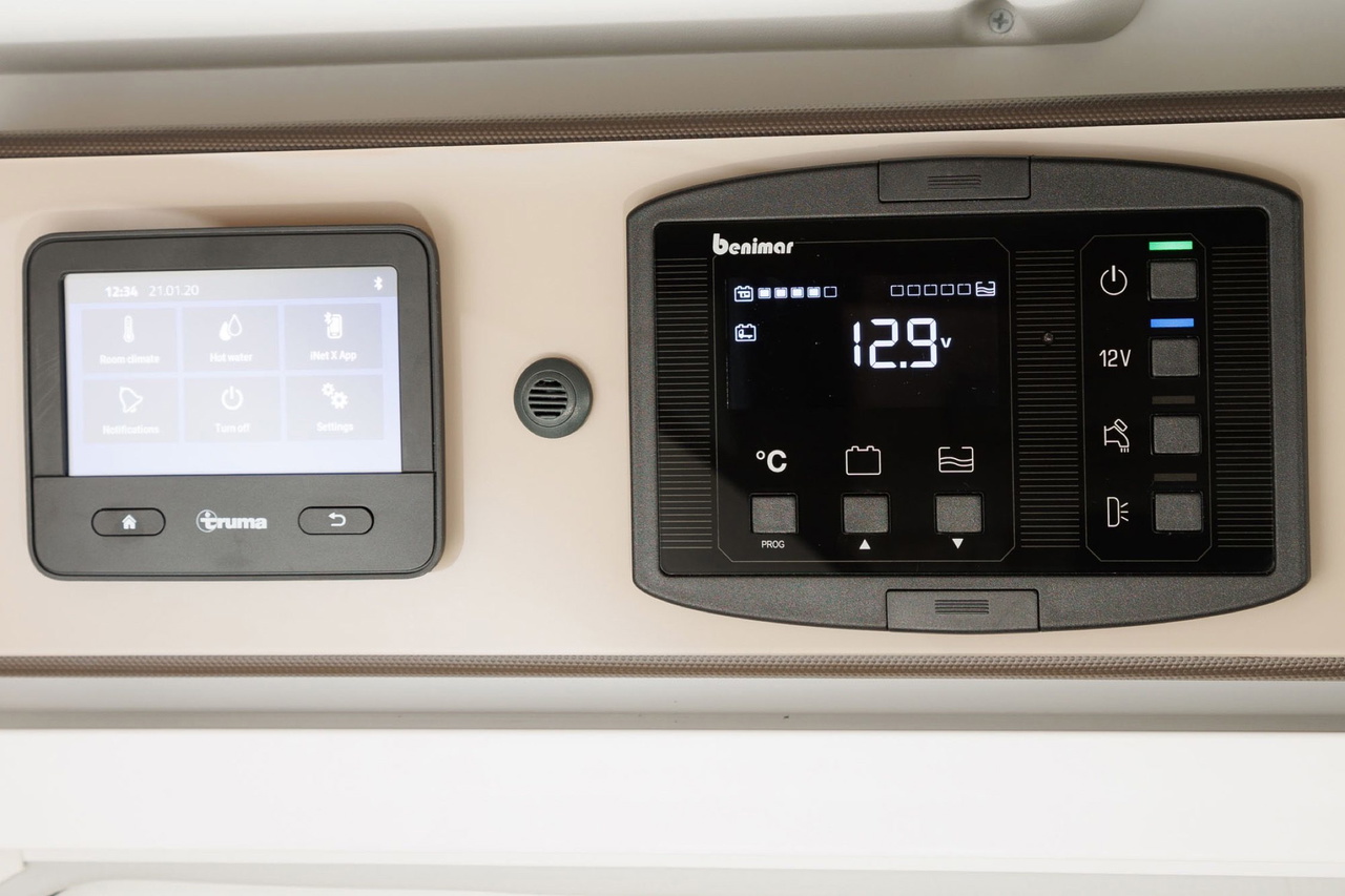 Para controlar tanto la calefacción como muchos otros apartados de la autocaravana (como las luces, bomba de agua o el estado de los depósitos) se incluye el panel Truma iNext X que tiene incluso conectividad móvil. La Mileo también cuenta con diferentes tomas USB, 12v y 220v, oscurecedores y mosquiteras, pack LED interior completo, booster de 22A, etc.