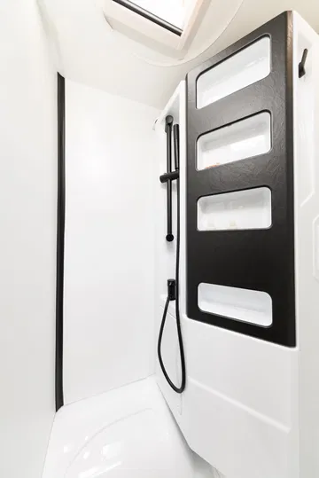 Conseguir tanto espacio habitable en apenas 7,2 metros se logra también gracias al uso de un baño variable que puede modificar su función en unos segundos. Para conseguirlo la marca ha añadido una pared abatible que esconde la zona de ducha y cuando no se usa, queda a la vista el lavabo con su correspondiente espejo. La parte negativa de este sistema es que el suelo queda mojado tras la ducha, un poco incordio si luego quieres usar el baño (pero se soluciona con una tarima opcional).