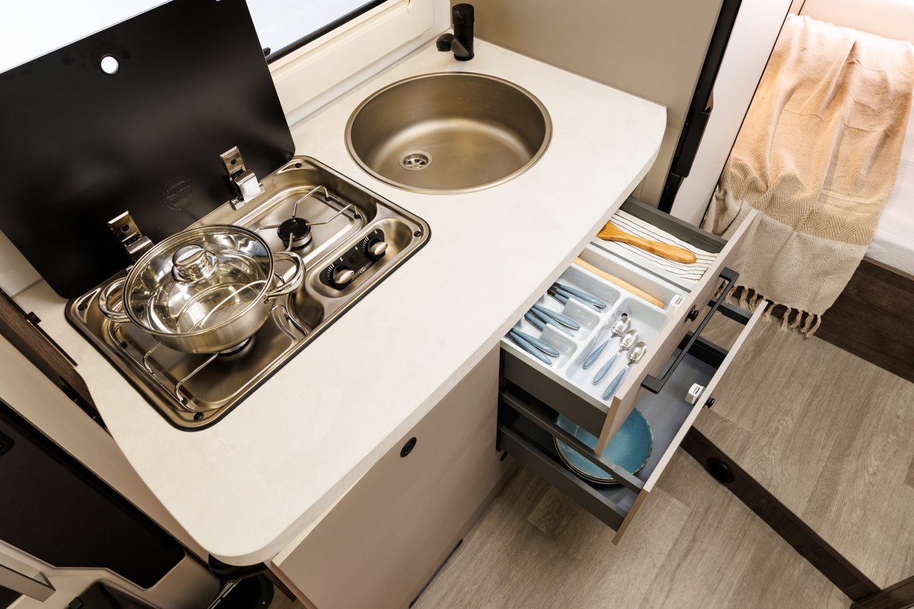 La cocina incluida en la Tessoro 425 contempla una encimera de razonables dimensiones, un fregadero generoso y cocina con dos fogones a gas. A destacar la nueva nevera de 150 litros a compresor con un práctico botellero (para guardar hasta nueve botellas de 1,5, litros). Si lo deseas se puede añadir un horno a gas aunque eso sí, te robará bastante espacio de almacenamiento.