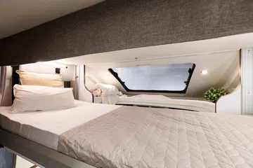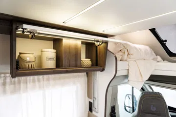 Para dormir el interior de la Benimar Tessoro 440 Up cuenta con una cama trasera transversal para dos personas, y una cama eléctrica individual sobre el salón. Si se desea también se puede hacer otra cama en la parte inferior del propio salón aunque no será tan cómoda como las otras. Bajo la cama posterior hay un amplio espacio de almacenaje con luz, argollas para sujetar la carga, etc, que se puede variar en altura (también mueve la cama).