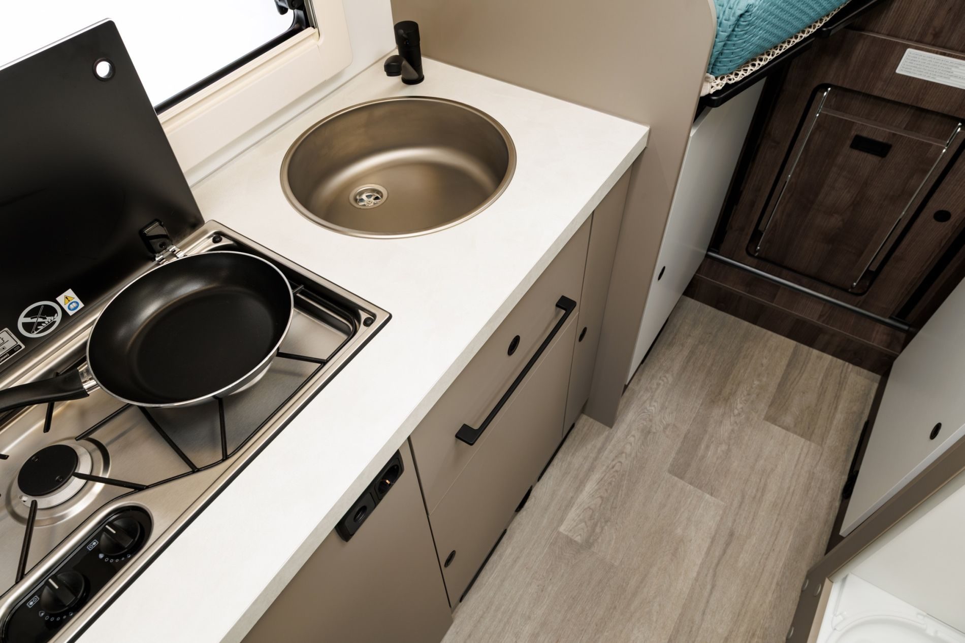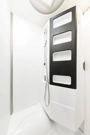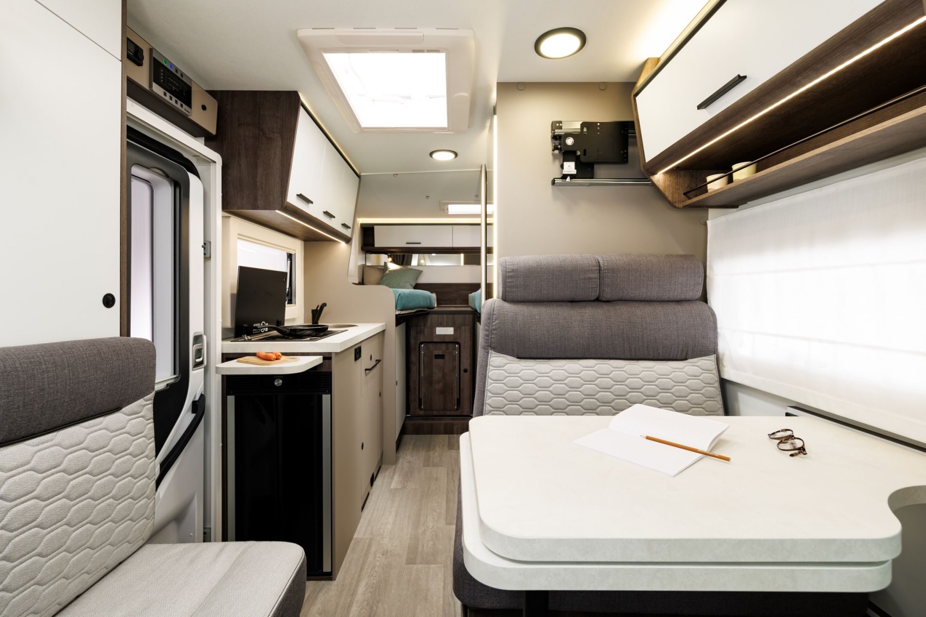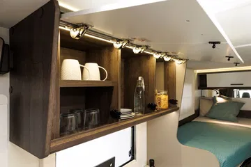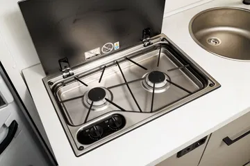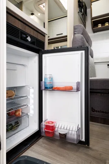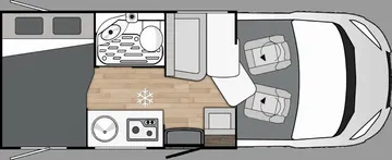 En la zona de vivienda encontramos una dotación muy completa que además se podrá mejorar mediante paquetes y muchos elementos opcionales. De serie van con cocina de dos fuegos a gas, fregadero de buen tamaño, nevera pequeña de 70 litros con apertura bilateral, botellero vertical, especiero iluminado, diversas tomas de 220v, 12v y USBV, iluminación LED interior, baño completo variable, etc.