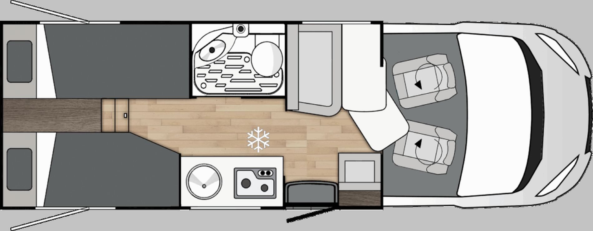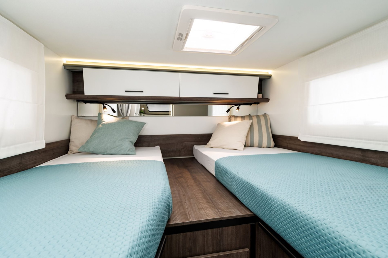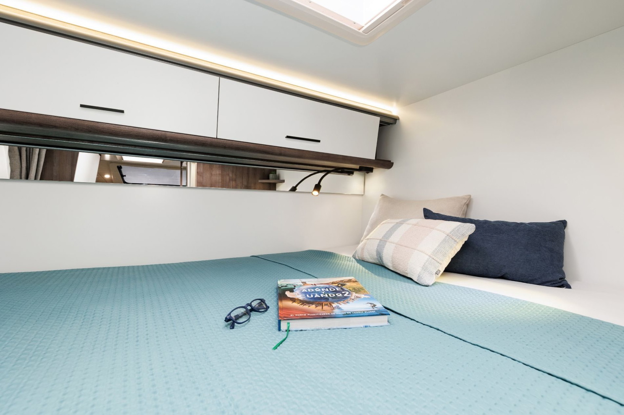 - Yrteo 861: La alternativa a las campers grandes L4 de 6,36 metros, crece algo más y sube hasta los 6,69 metros para presumir de camas gemelas traseras de buen tamaño, un tipo de configuración que cada vez tiene más adeptos. Además cuenta con mucho espacio de almacenaje en el garaje, una cocina de buen tamaño y un baño variable muy práctico