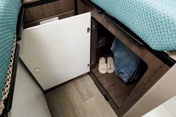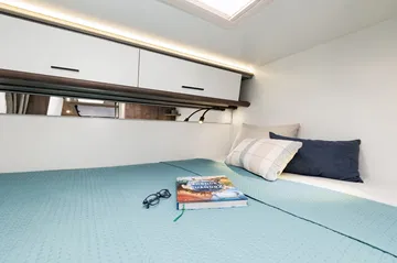 La calefacción instalada en la Benimar Yrteo es una Webasto 4000w a diésel mientras que el boiler para calentar el agua utiliza gas. Repartidos por el interior hay multitud de huecos, armarios y cajones para guardar objetos. Todas las ventanas cuentan con oscurecedores y mosquiteras, algo extensible también a las claraboyas. La puerta de entrada es de tipo XL, mucho más cómoda. La centralita electrónica y el booster de 22A completan la dotación estándar.