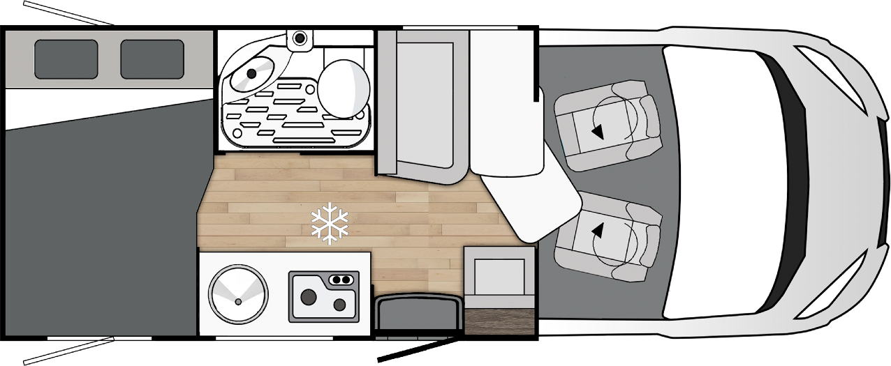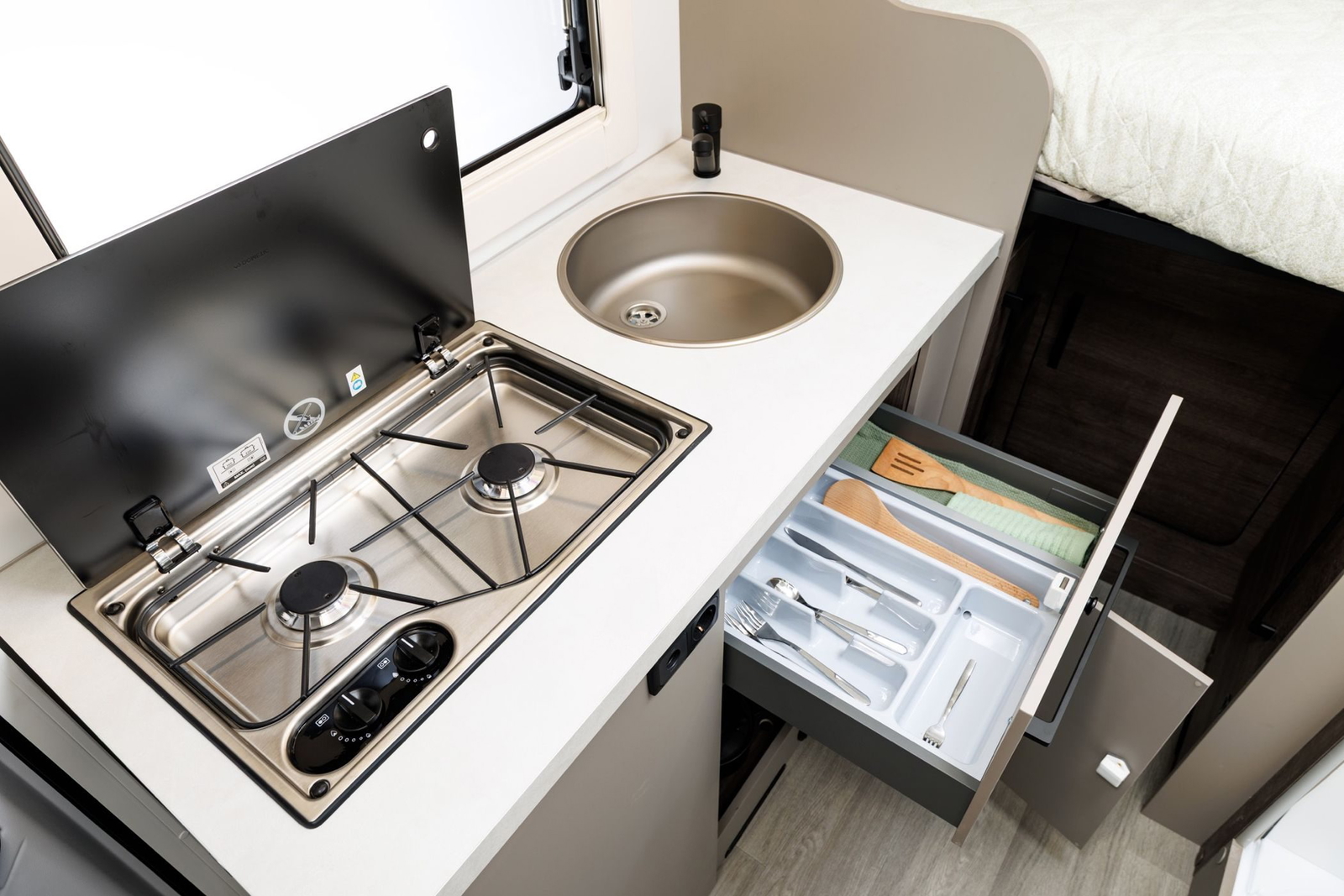 Al tener un interior más estrecho que en las autocaravanas la marca española ha apostado por utilizar una nevera de compresor de 70 litros que tal vez antoja algo pequeña para viajes largos alejados de la civilización. La cocina sí cuenta con espacio suficiente para garantizar un cocinado perfecto, con dos fuegos a gas, un fregadero de buenas dimensiones y la posibilidad de extender un poco más el espacio de encimera.