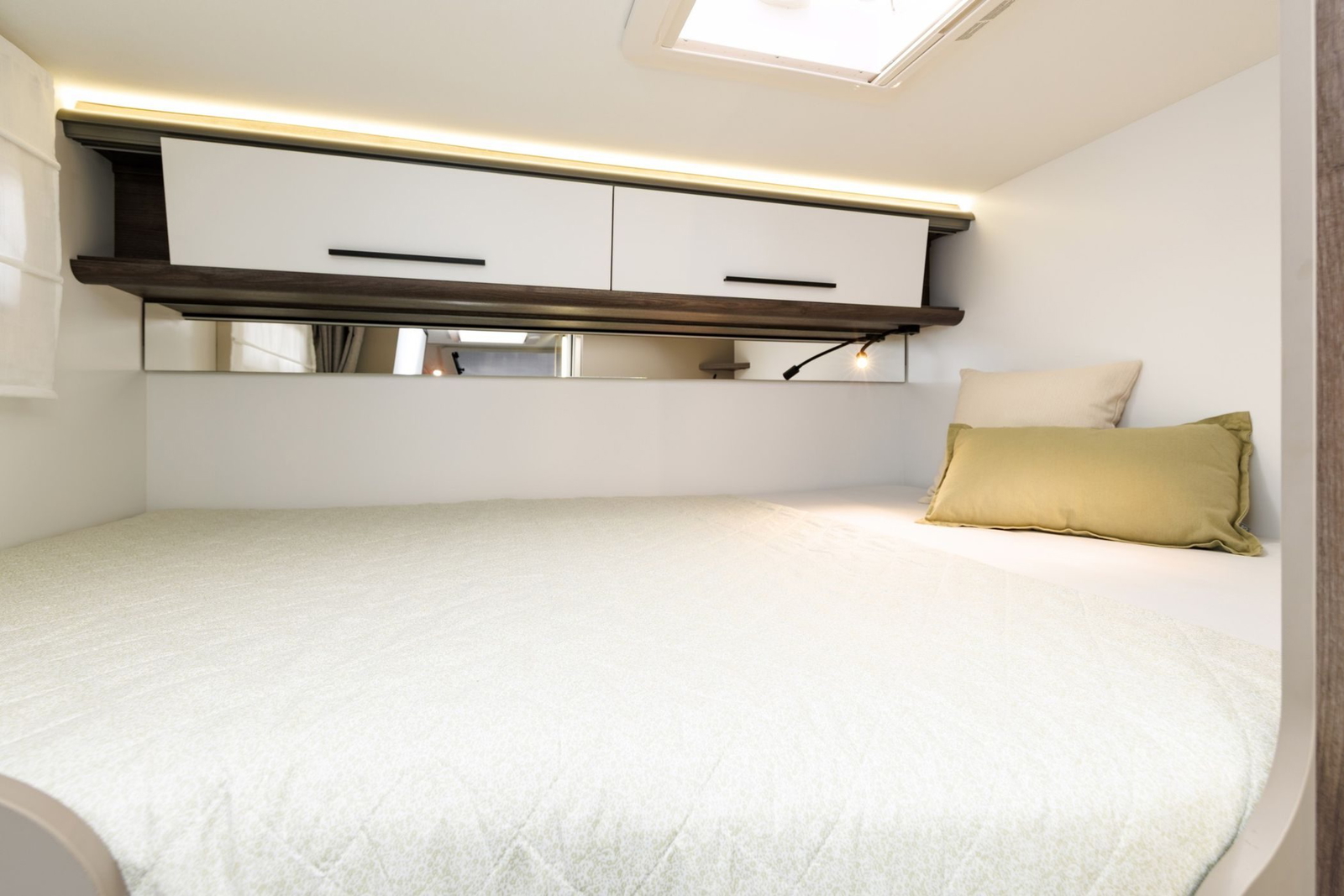 La distribución interior de la Yrteo 840 sigue el esquema habitual de las campers, con el salón en la zona delantera, cocina completa en la parte media junto al baño, y la zona de descanso en la parte posterior. Benimar ha apostado por una cama transversal de 1.35 metros de ancho y 196 metros de largo, además de otra cama adicional en la zona del comedor para una persona de 1,81 metros por 90 cm de anchura; pequeña pero útil.