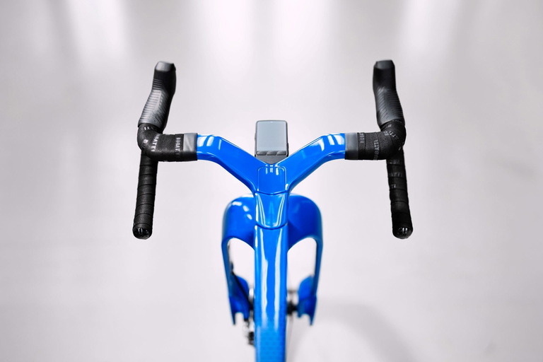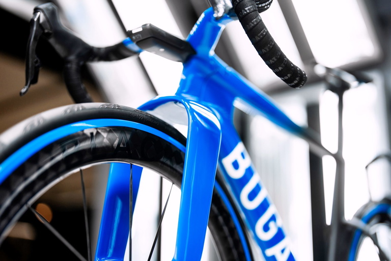 En esta bici, el azul se combina con la prominente inscripción blanca «BUGATTI» a lo largo del cuadro, para dejar claro de qué bici se trata. Hay más guiños a la marca, como el icónico elefante, uno de los símbolos de la marca, que aparece en la parte frontal como homenaje al legado de Bugatti.