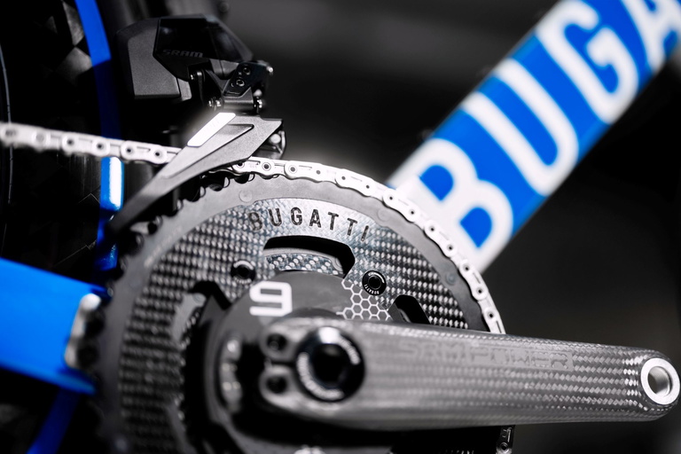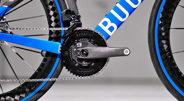 Lleva discos de freno de carbono y acero de 160 mm, transmisión electrónica con potenciómetro SRM Origin PM9 integrado, un plato Carbon-Ti con fibra de carbono brillante 3K y dientes de titanio de grado 5 con el logotipo de Bugatti.