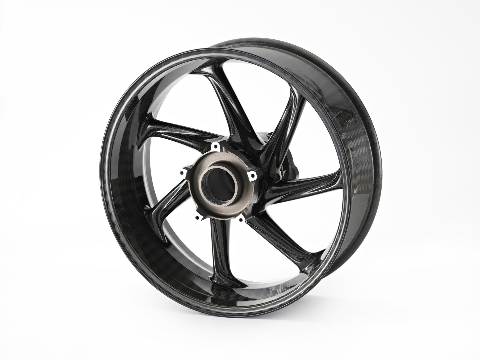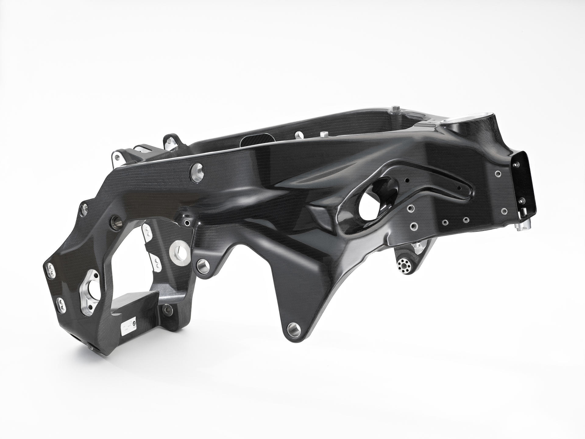 Un chasis hecho en fibra de carbono, como su carenado, como sus llantas, como el apoyo del sillín…