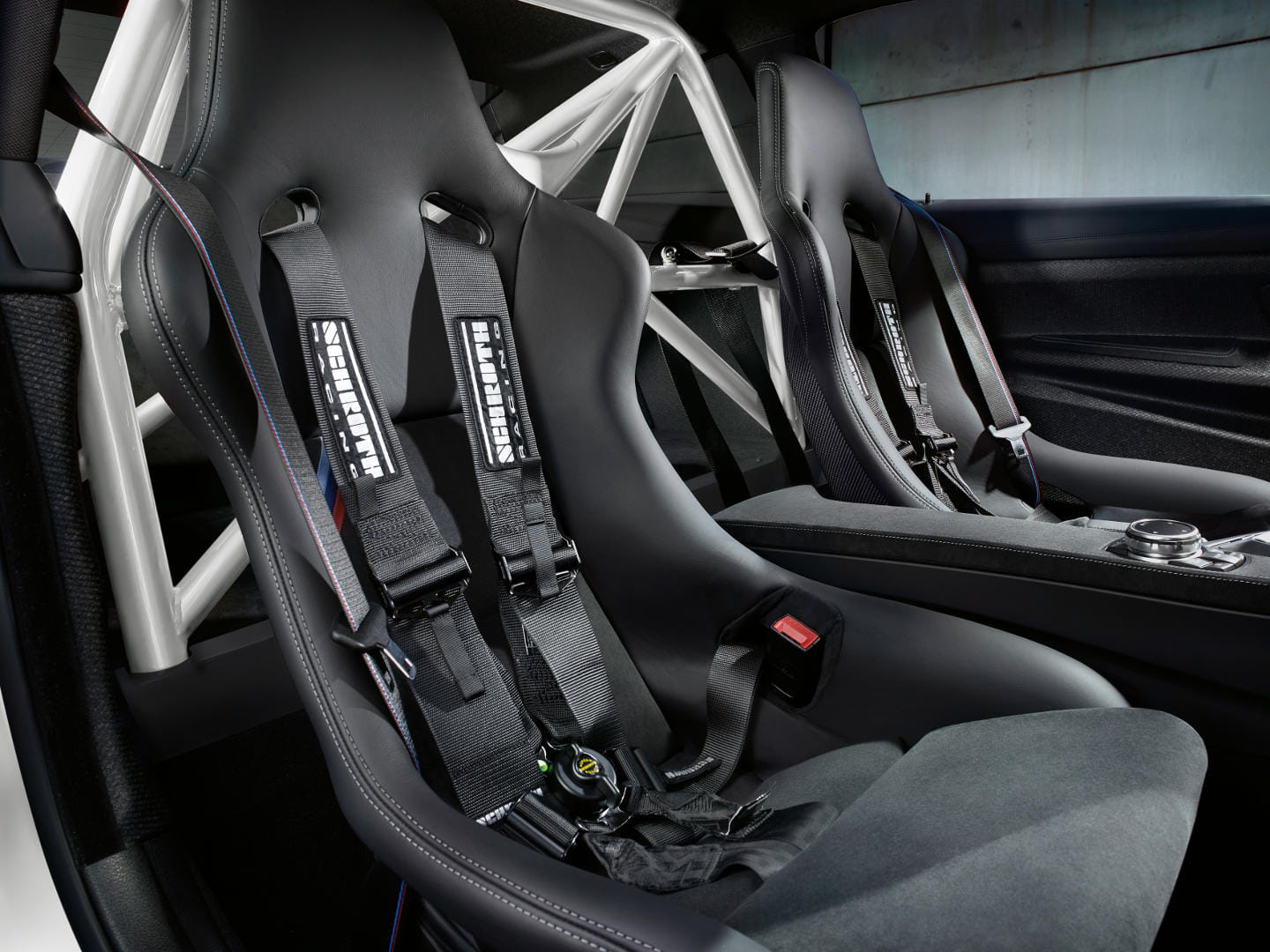 En el interior de este BMW Serie 4 biplaza no faltan unos buenos buckets ni una jaula antivuelco, ahora acabada en blanco en lugar del tono dorado empleado en el GTS