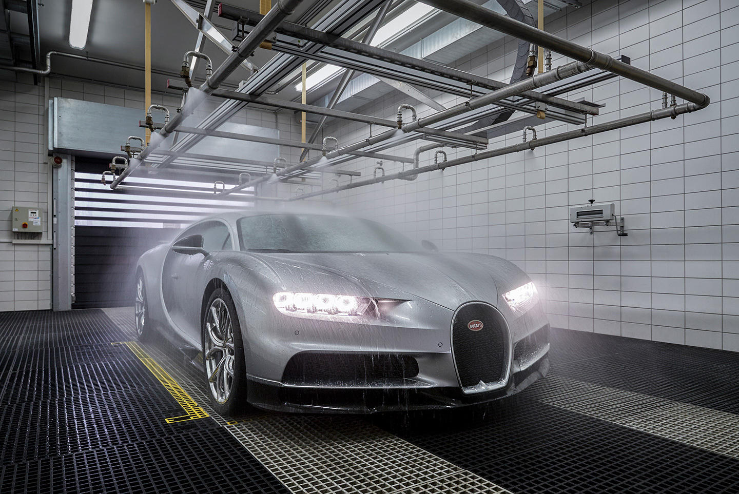 9. Tras el ensamblado final, Bugatti pone a prueba a cada Chiron en el banco de rodillos más potente del mundo. Suficientemente potente como para trabajar con un Bugatti Chiron de 1.500 CV a pleno rendimiento y simulando velocidades superiores a los 200 km/h. Estas pruebas se prolongan hasta tres horas y en ellas el vehículo recorre un total de 60 kilómetros. Bugatti prueba incluso la estanqueidad de cada coche en un túnel meteorológico en el que se simulan las condiciones más adversas, con intensidades dignas de la lluvia de un monzón, para asegurarse de que no hay fugas.