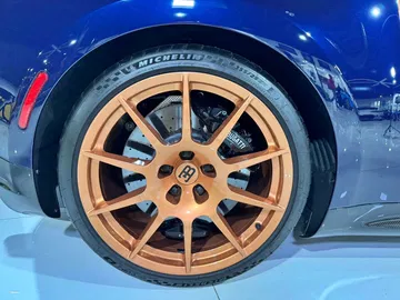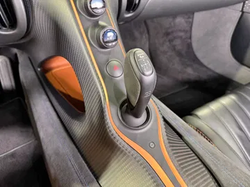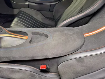 La curiosa combinación de colores exterior contrasta con la configuración del habitáculo, bastante sencilla y sobria. El interior es casi todo negro, con la excepción de algunos pequeños detalles en dorado y costuras en azul a juego con la pintura exterior. La fibra de carbono adorna el salpicadero y la consola central, mientras que la piel y la Alcantara cubren unos asientos donde el confort, incluso en esta versión más radical, sigue siendo lo más importante.