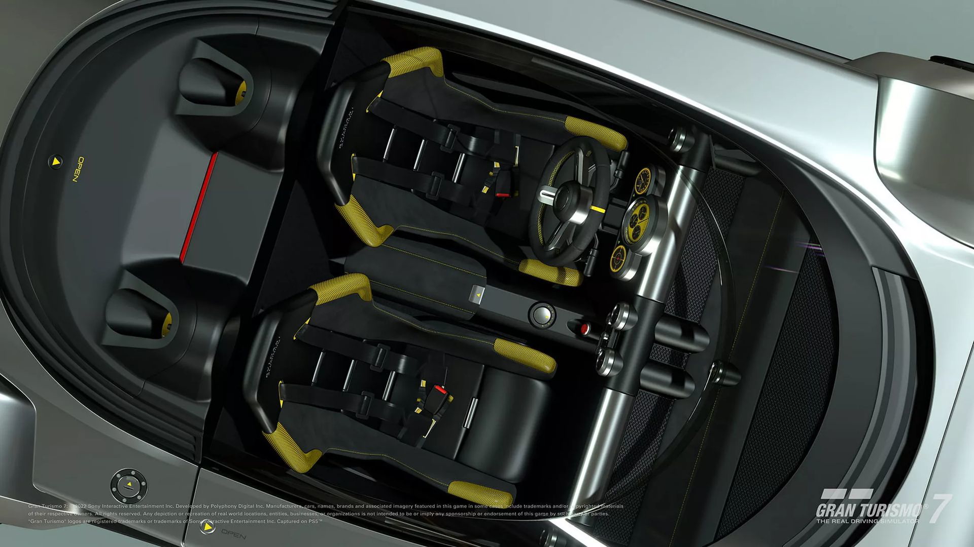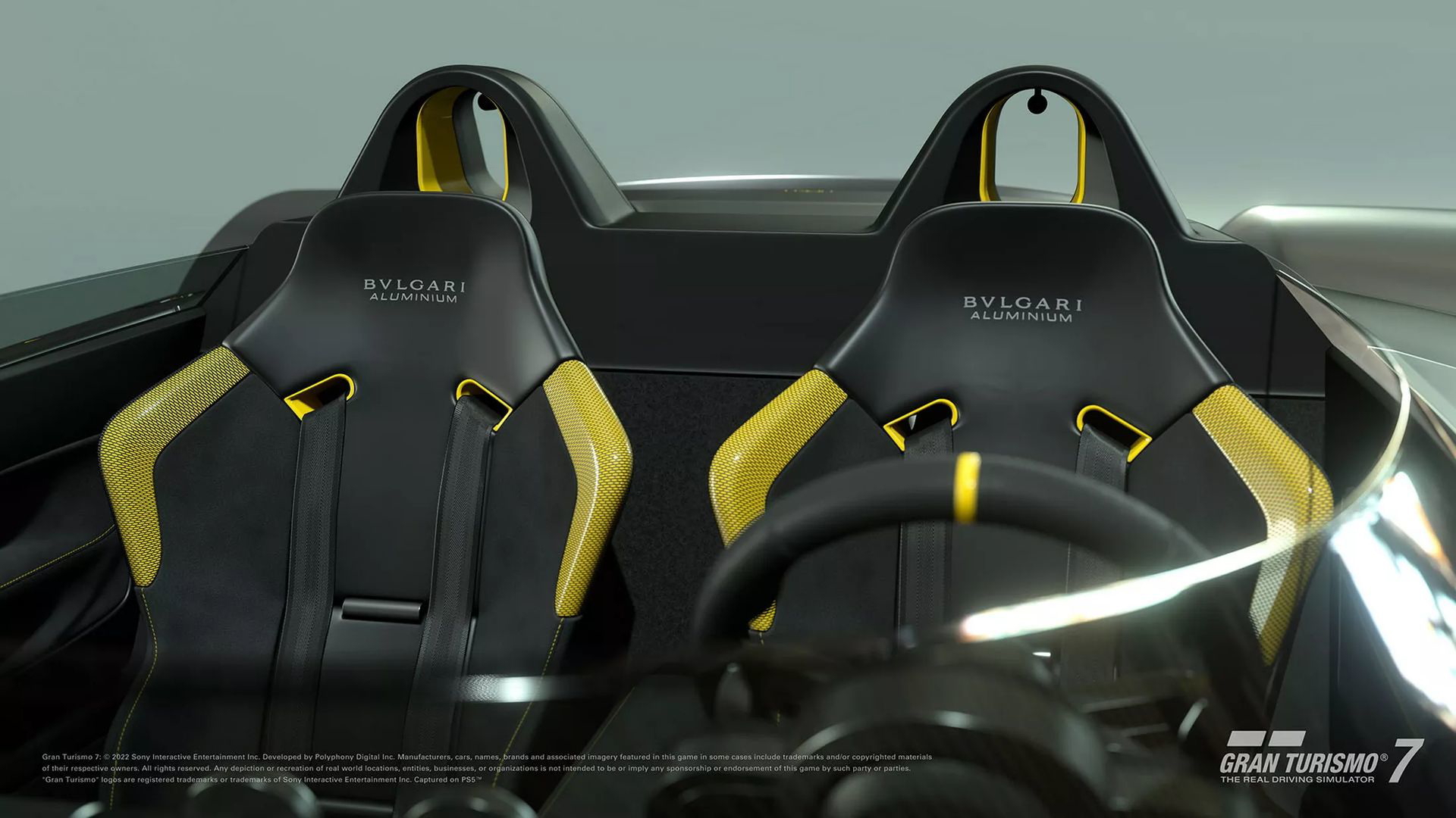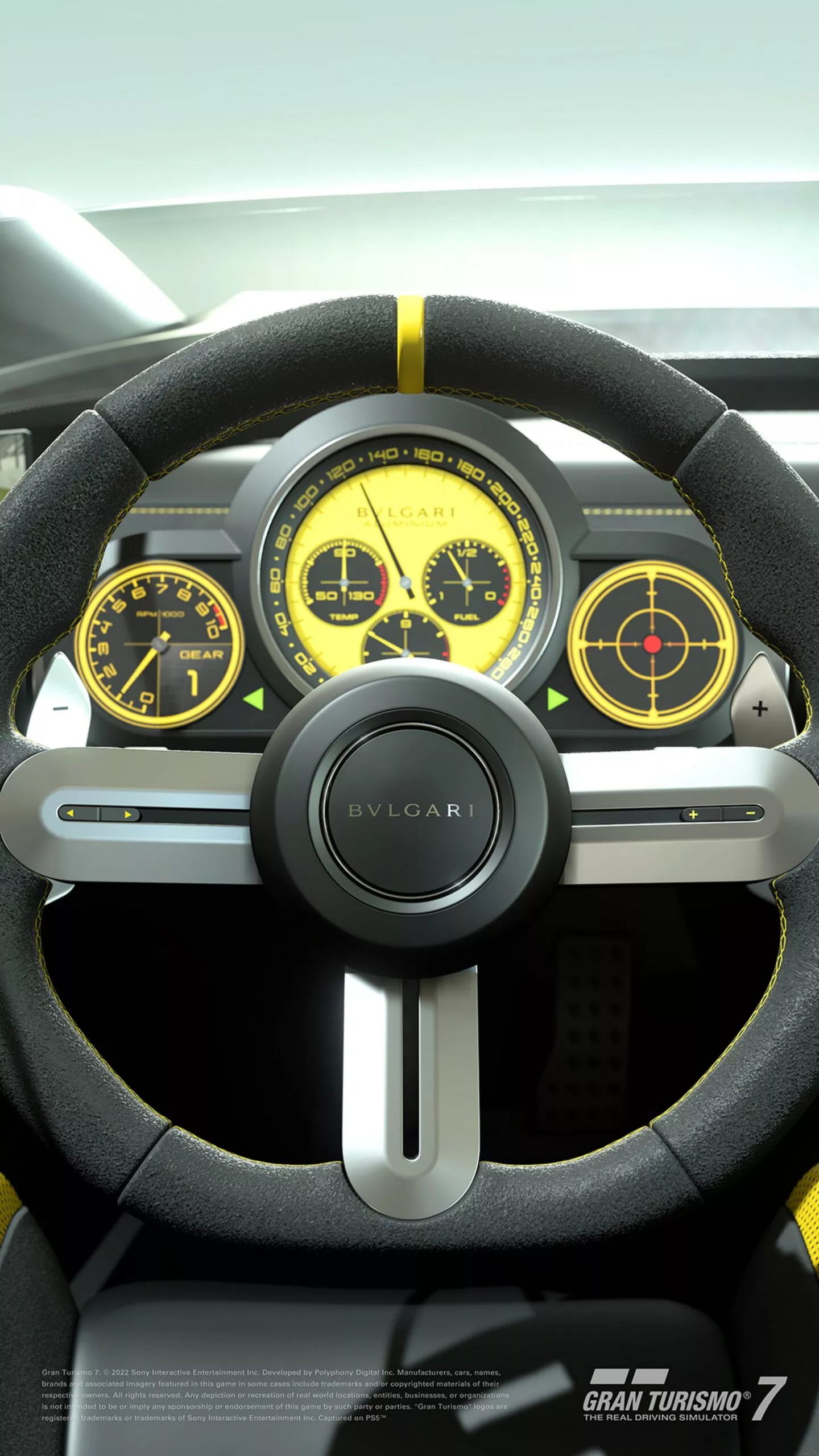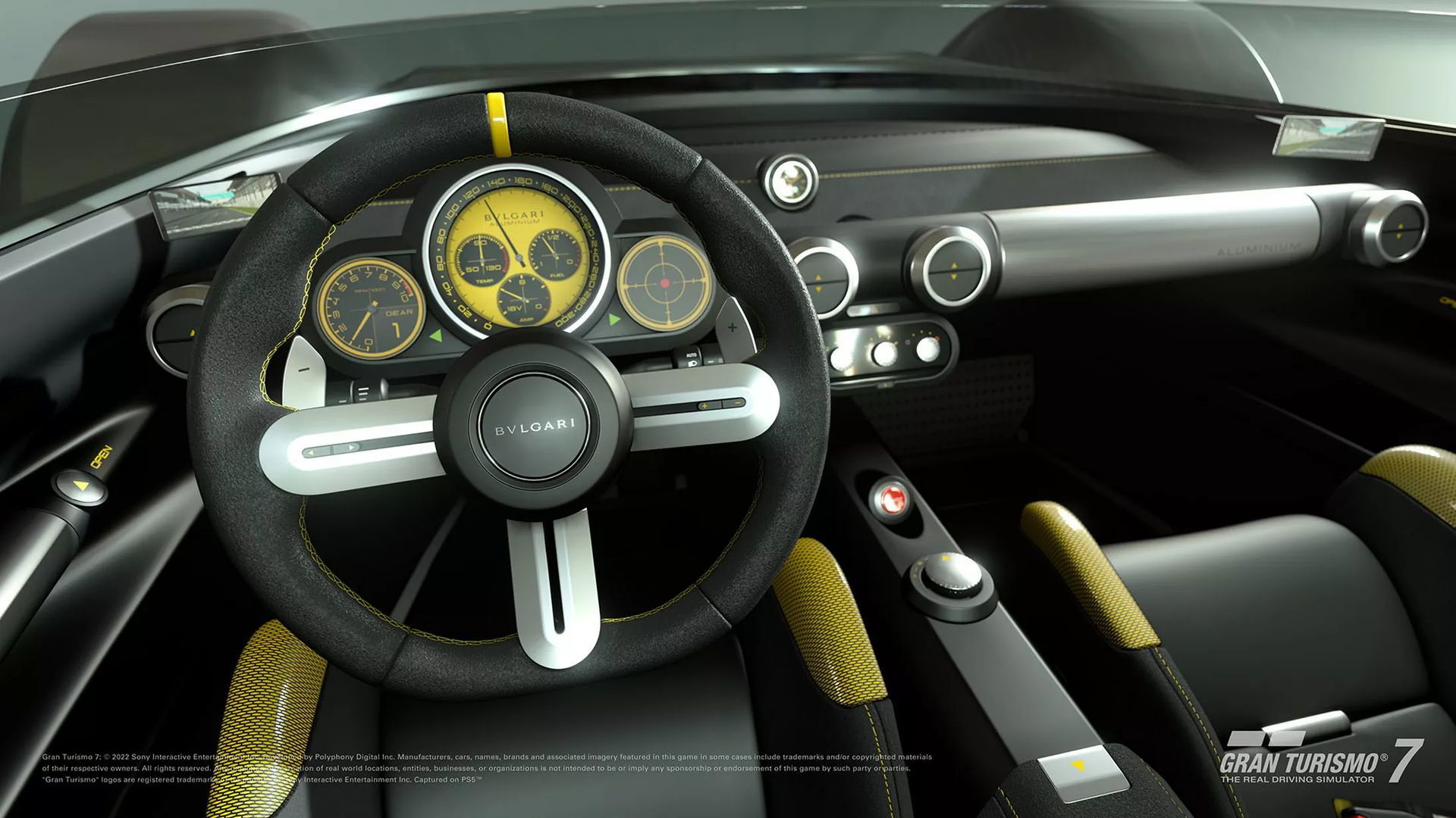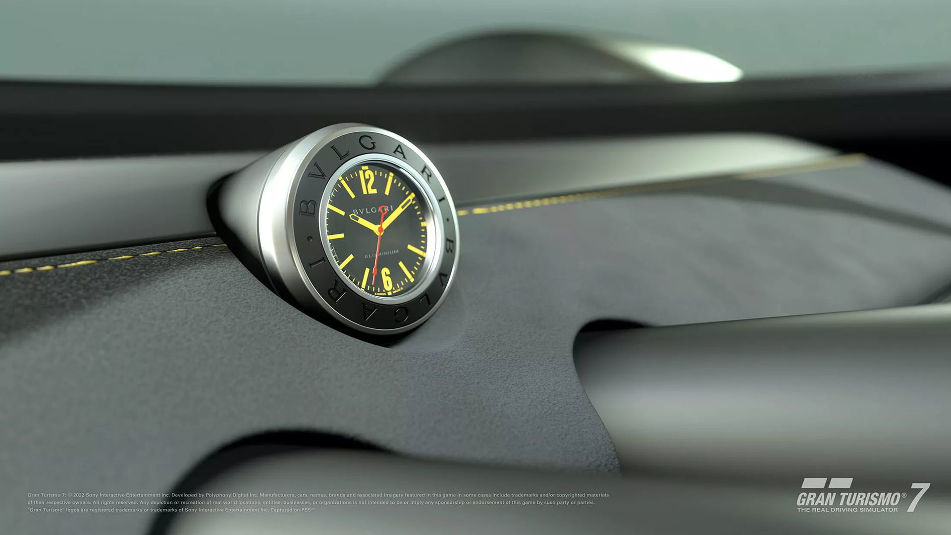 En el interior se percibe de forma clara la influencia del mundo de los relojes. De hecho, la instrumentación del coche es prácticamente una copia de la esfera del Bulgari Aluminium, a su vez inspirado en los grandes GT italianos de los años ochenta y noventa – ¿alguien dijo Lancia Delta Integrale? El habitáculo es biplaza, está teñido en colores negro y amarillo, y el salpicadero está presidido por un cronómetro analógico. A nivel técnico, este coche virtual equipa un motor de cuatro cilindros, capaz de girar a 10.000 rpm, conectado a un cambio de siete relaciones.