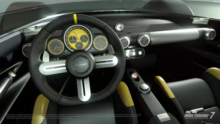 En el interior se percibe de forma clara la influencia del mundo de los relojes. De hecho, la instrumentación del coche es prácticamente una copia de la esfera del Bulgari Aluminium, a su vez inspirado en los grandes GT italianos de los años ochenta y noventa – ¿alguien dijo Lancia Delta Integrale? El habitáculo es biplaza, está teñido en colores negro y amarillo, y el salpicadero está presidido por un cronómetro analógico. A nivel técnico, este coche virtual equipa un motor de cuatro cilindros, capaz de girar a 10.000 rpm, conectado a un cambio de siete relaciones.