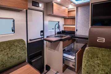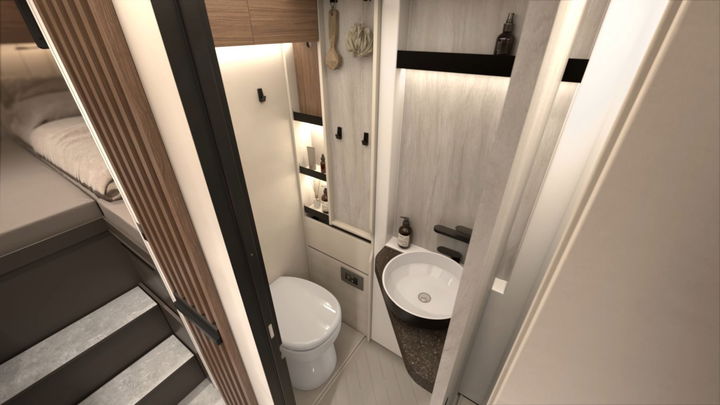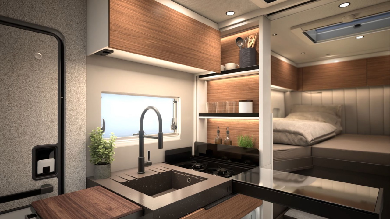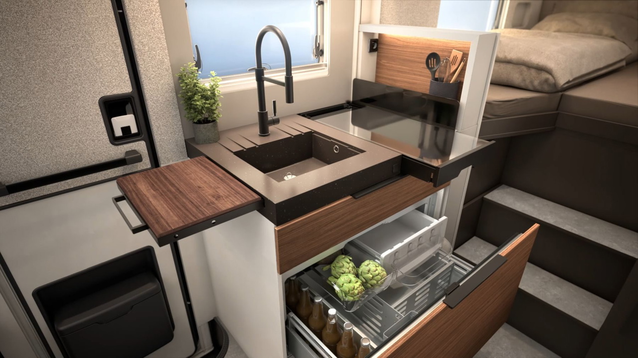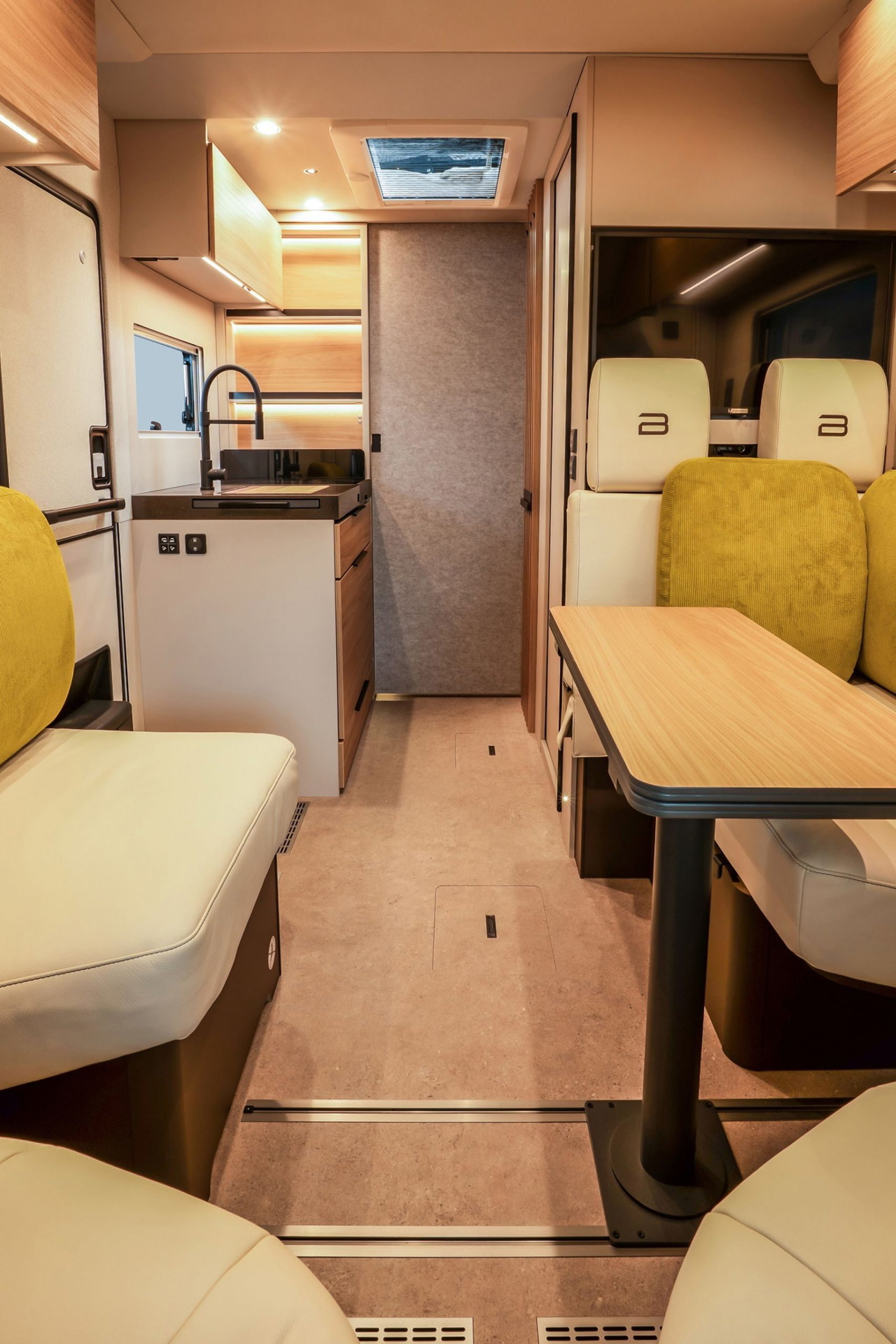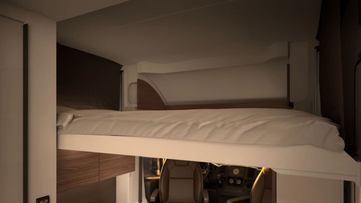 En el interior ocurre algo parecido, apostando por una decoración única que se acompaña de materiales de gran calidad, paredes con doble aislamiento y zonas de cocina o baño modulares para conseguir un mejor aprovechamiento del espacio. En las dos opciones de configuración interior es posible añadir una cama superior en el salón de accionamiento eléctrico.