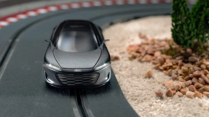 Concretamente, se trata de un Audi Grandsphere en miniatura y compatible con las pistas del célebre fabricante de slot. A grandes rasgos, ese fue un vehículo conceptual que la empresa alemana presentó en 2021 como una berlina futurista que adelantaba el diseño de sus próximos modelos de gran lujo. Medía 5,35 metros de largo, contaba con un sistema de propulsión 100% eléctrico de hasta 720 CV y 750 km de autonomía, así como con conducción autónoma y un amplio elenco de innovaciones tecnológicas.