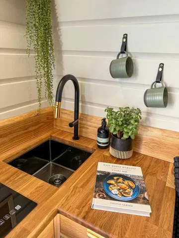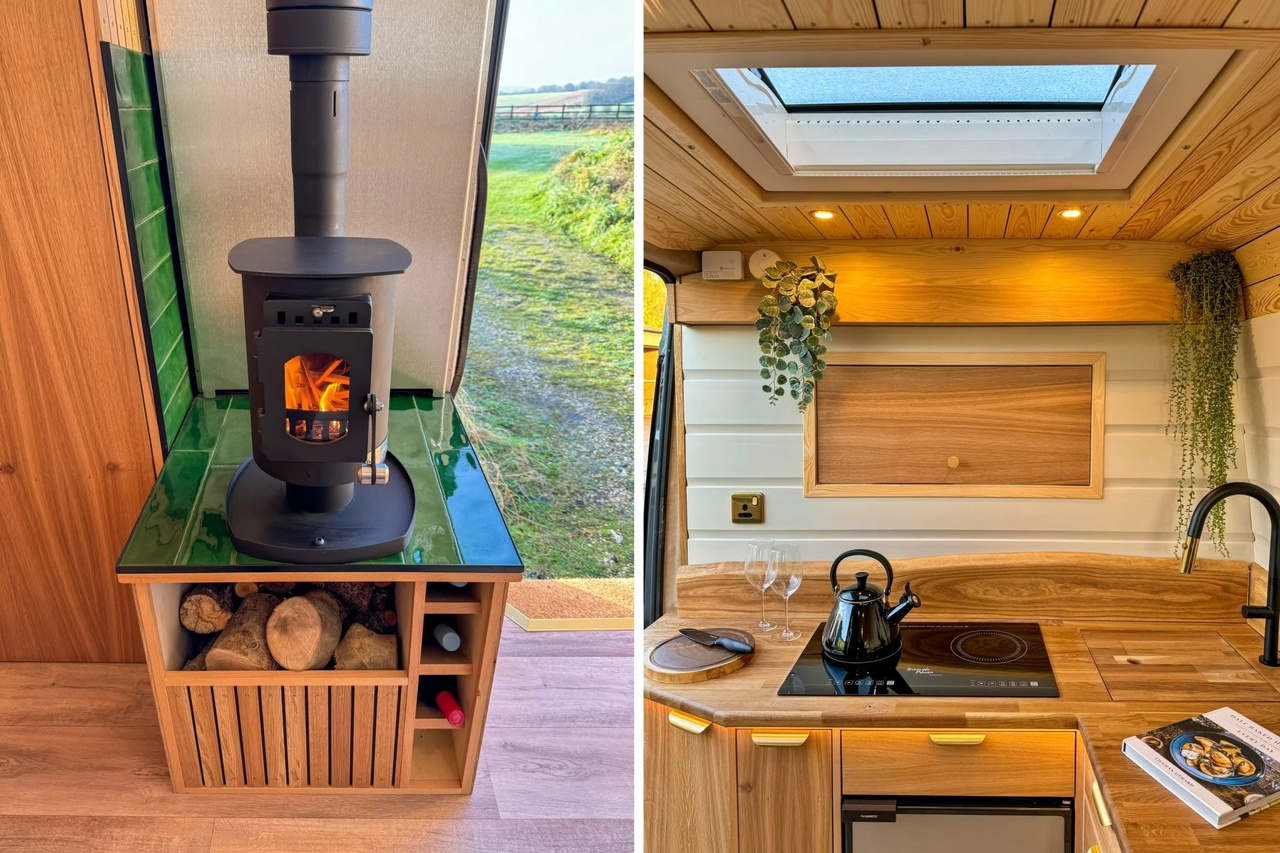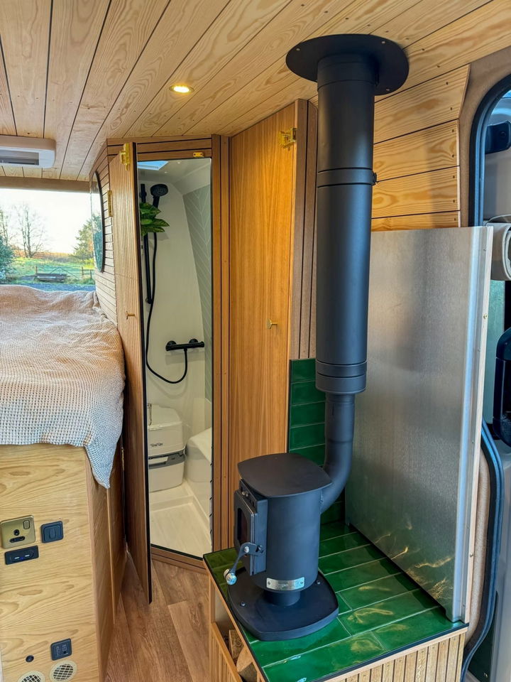 El confort queda en manos de un sistema de calefacción a gas, un aislamiento multicapa pensado para climas extremos y una cocina completa con encimera de roble macizo, nevera de compresor de 12 V, fregadero, cocina de dos fuegos y bastante espacio de almacenamiento, incluido despensa extraíble según configuración. La ducha no es de serie: forma parte de un paquete opcional de pago que añade cabina independiente con plato de fibra, agua caliente y fría, ventilación específica y salida de calefacción para un uso cómodo durante todo el año.