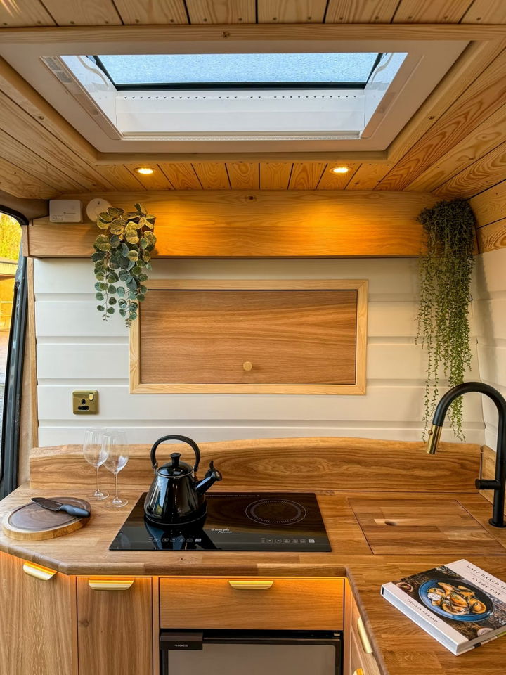 A nivel técnico, esta camper integra un sistema eléctrico completo que funciona en torno a una batería de litio de 230 Ah, una panel solar de 200 W y un inversor MultiPlus de 500 W. Todo ello para tener a disposición del usuario una toma exterior, carga B2B y varias tomas USB, USB-C y enchufes de 230 V. El sistema de agua combina depósitos de aguas limpias y grises instalados en los bajos, vaciado eléctrico y producción de agua caliente mediante LPG, con grifo extraíble de agua fría y caliente.