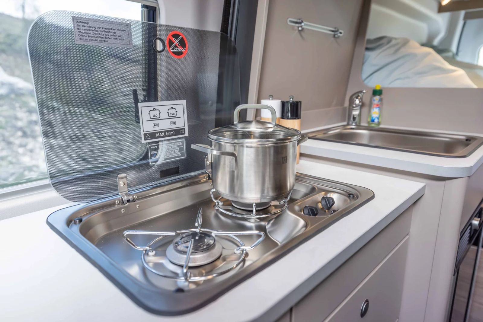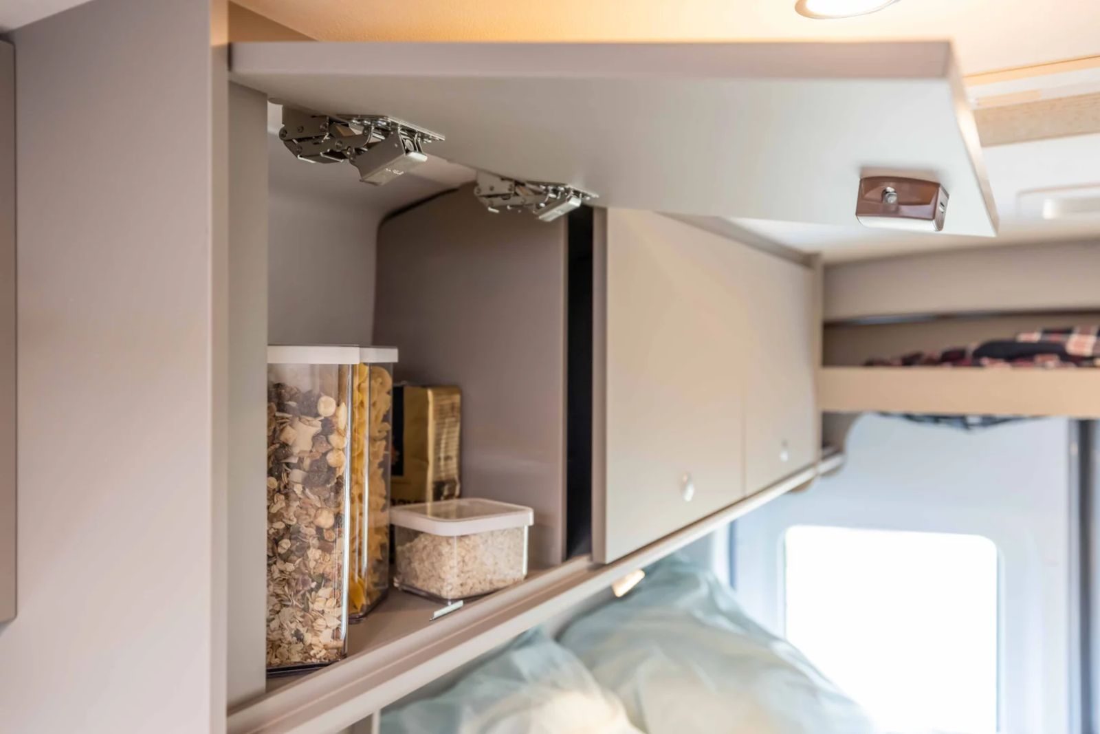Además de las tomas USB y de 230 v repartidas por el interior, la Carado CV590 4×4 cuenta con cocina completa con dos fuegos y fregadero integrado, nevera de compresor de 62 litros, compartimento para dos bombonas de gas de 11 kg, calefacción a gas Truma Combi 4, baño completo con lavamanos, ducha y cassete toilet C223, pack iluminación LED interior, cama de matrimonio posterior, diversos muebles para almacenaje, etc.