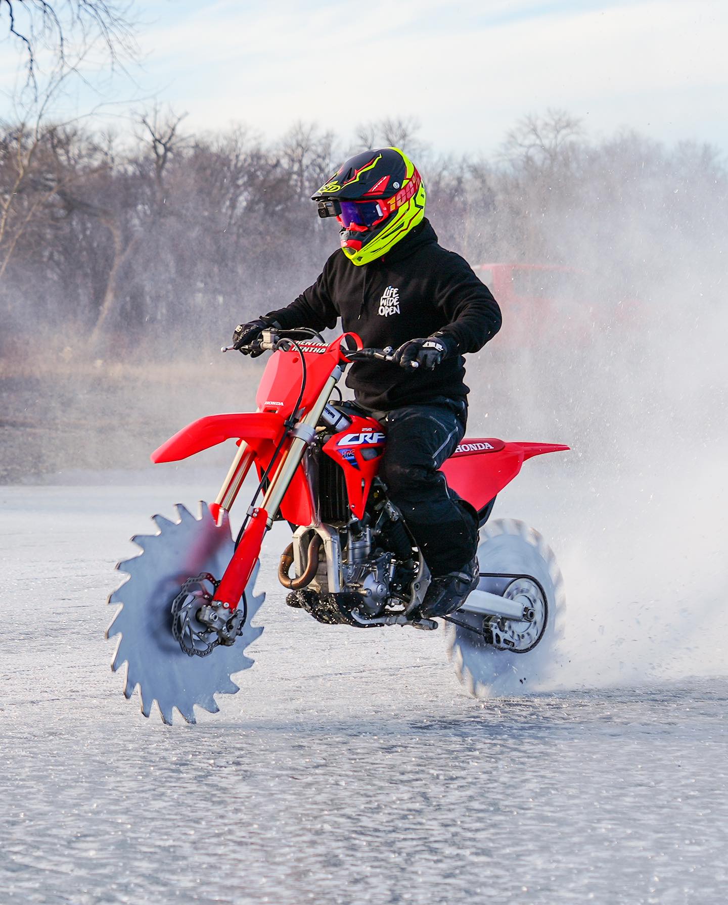Tras la instalación, se trasladaron a una de sus pistas de pruebas preferidas, un enorme lago helado. Debido al peso extra de los discos, como era de esperar, la moto se movía peor. Eso sin hablar de que el disco trasero picaba el hielo y se hundía casi sin avanzar.