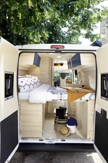 La mayor diferencia entre la V114 y la V114M está en que la primera solo cuenta con una cama de matrimonio trasera colocada de forma transversal, y la M añade una litera también apta para dos. En este caso la inferior va situada un poco más abajo así que el espacio de carga disponible es un poco más pequeño. La cama superior es perfecta para niños o adultos que no pesen mucho.