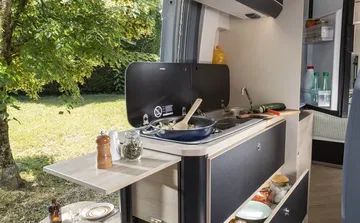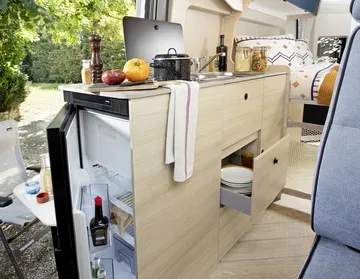 En la zona de vivienda encontramos una cocina completa con dos fuegos a gas, fregadero, nevera de 84 litros con congelador, diversos armarios y cajones repartidos por el habitáculo, baño completo con ducha y potti extraíble, mosquiteras y oscurecedores en ventanas, pre-instalación de TV, extensión de mesa del comedor, peldaño de acceso, calefacción a gas, etc