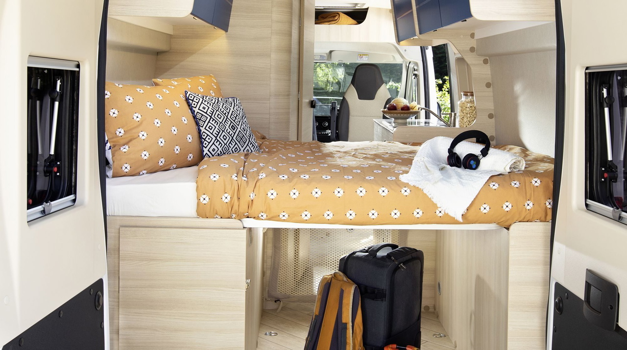 La mayor diferencia entre la V114 y la V114M está en que la primera solo cuenta con una cama de matrimonio trasera colocada de forma transversal, y la M añade una litera también apta para dos. En este caso la inferior va situada un poco más abajo así que el espacio de carga disponible es un poco más pequeño. La cama superior es perfecta para niños o adultos que no pesen mucho.