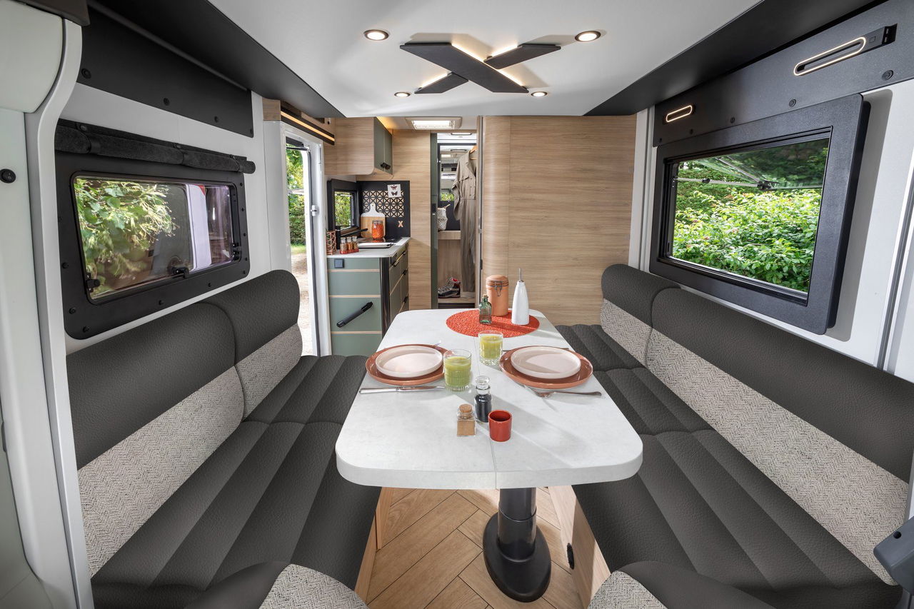 La Challenger X150 cuenta con una cocina de dimensiones muy interesantes y suficiente espacio de almacenaje. El salón es más grande de lo habitual y pueden comer sin problemas cinco o seis comensales. Eso sí, cuando llega la noche será mejor que no haya más de cuatro personas o alguno tendrá que dormir en el suelo (hay dos camas dobles, una basculante y la otra transformando la dinette).