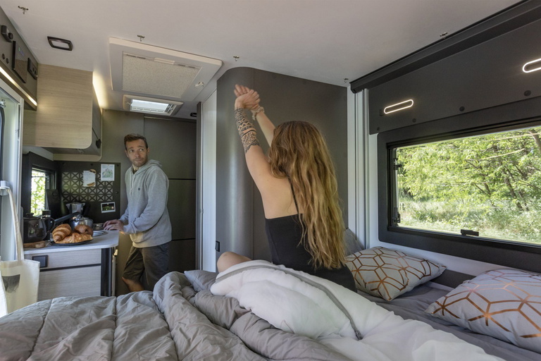 Completando la dotación para España están la centralita electrónica CP Plus de Truma, calefacción a diésel, faros antiniebla, anclajes ISOFIX, luz de avance en la puerta, soporte para televisión, preinstalación para placa solar, colchón premium de mayor grosor, toma de gas exterior, bisagras con amortiguador, etc.