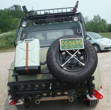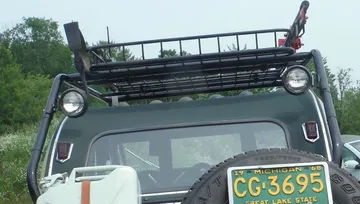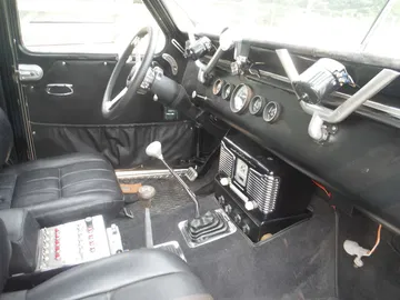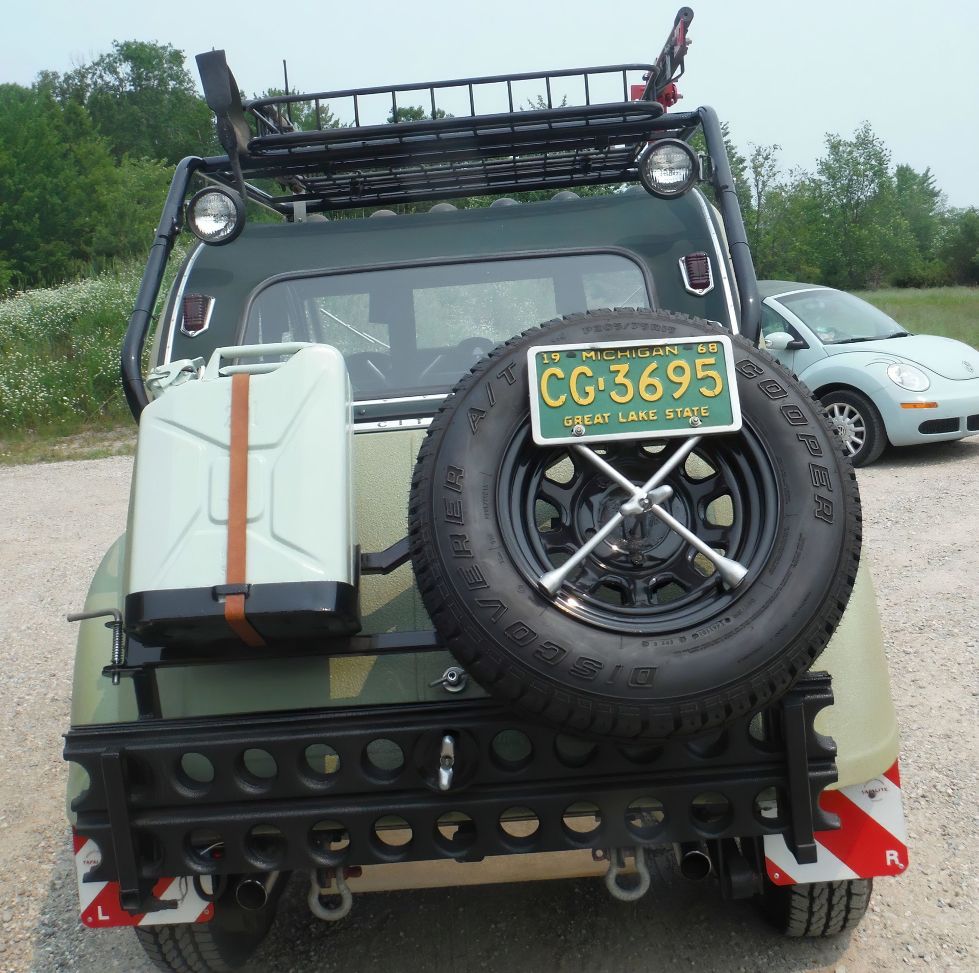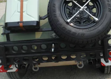 Empezando por fuera, impresionan sus defensas, sobre todo la trasera, compuesta por las propias barras de salvamento. También la lata de gasolina y la rueda de repuesto acopladas a una estructura que se abate hacia un lateral, la baca que hace jaula antivuelco y la iluminación adicional que lleva acoplada.